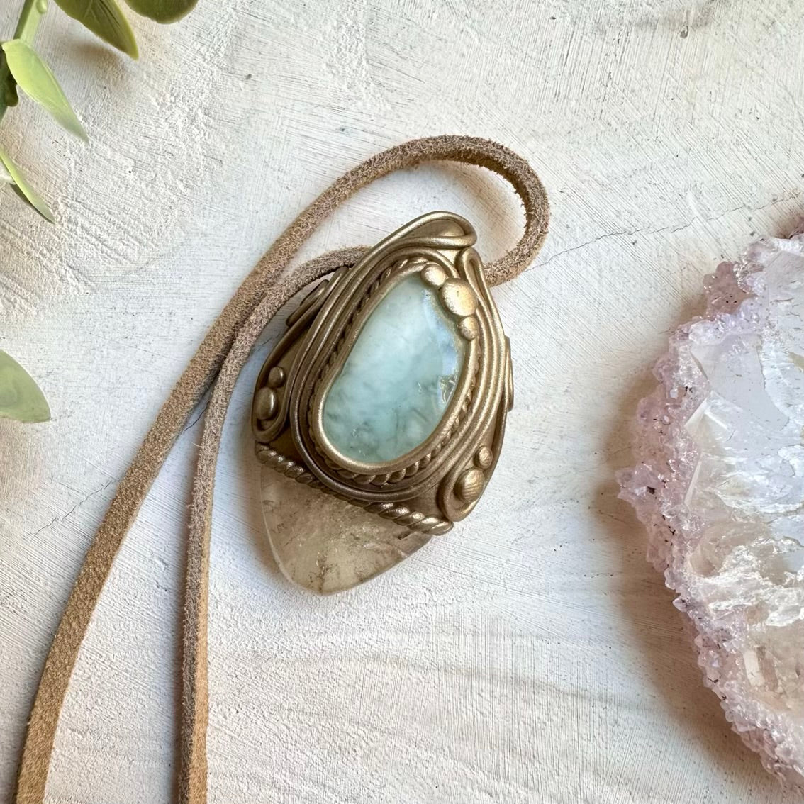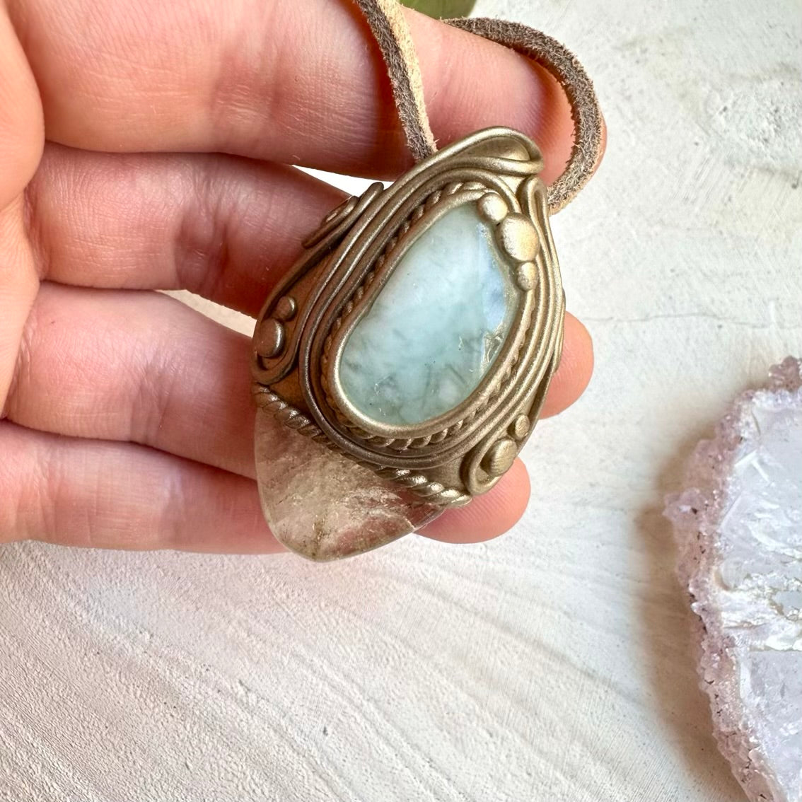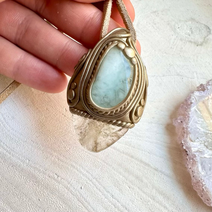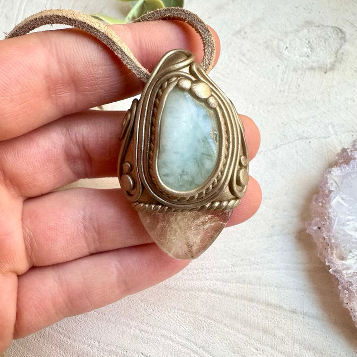The Citrine and Aquamarine Pendant, Gemstone Necklace is made with durable clay and it comes with adjustable leather cord.
