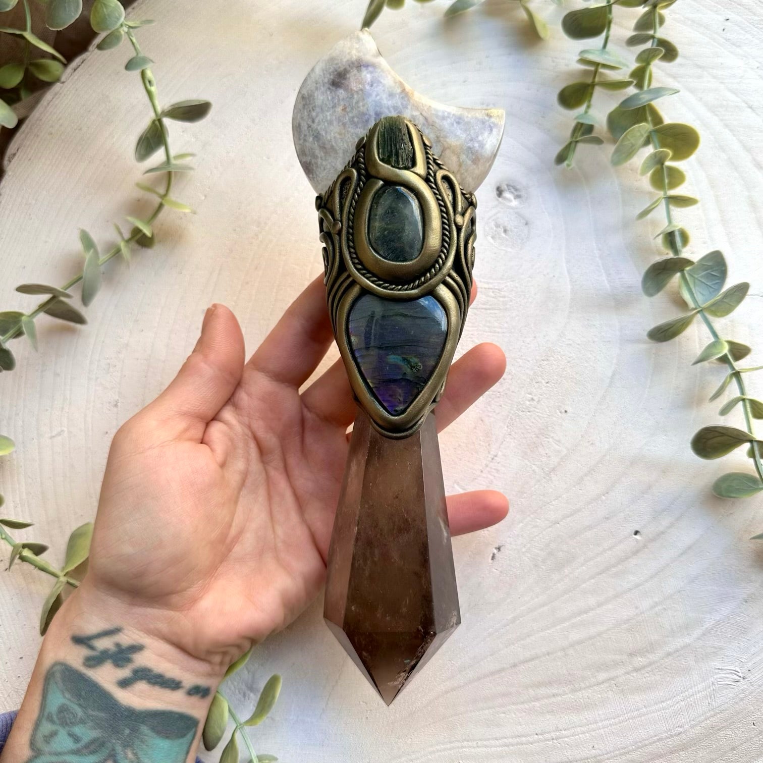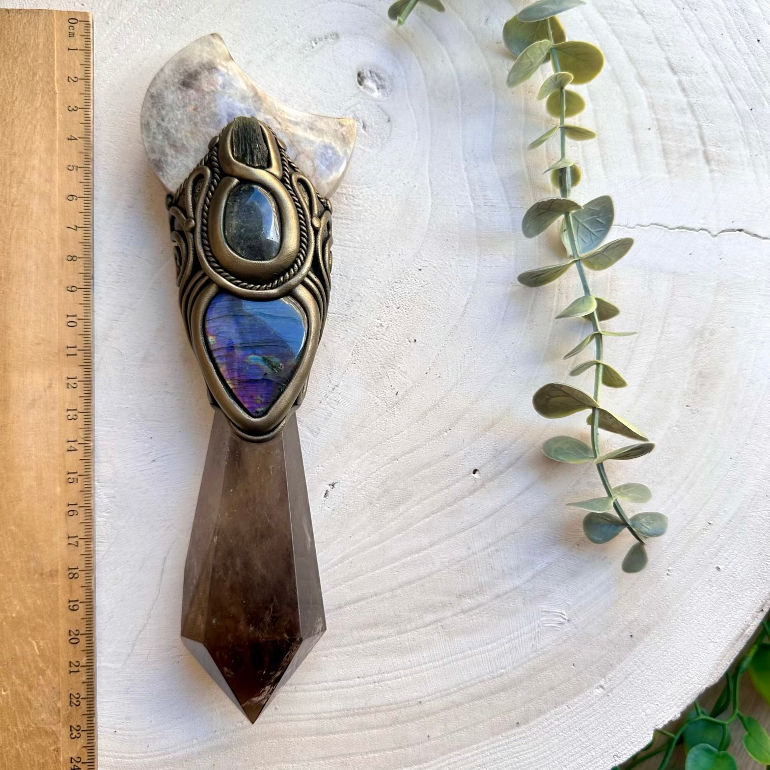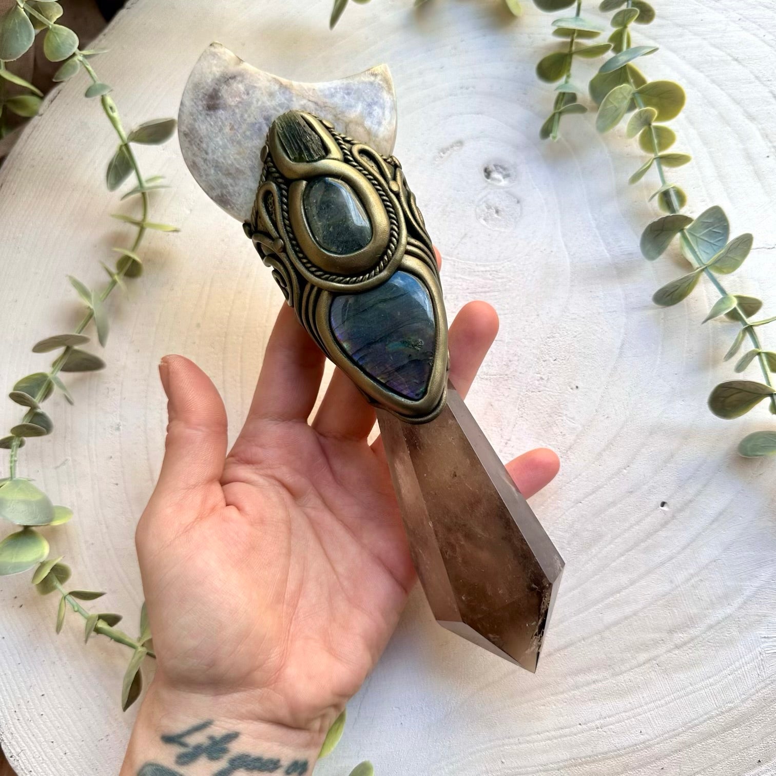 Handmade spiritual wand featuring smoky quartz and labradorite