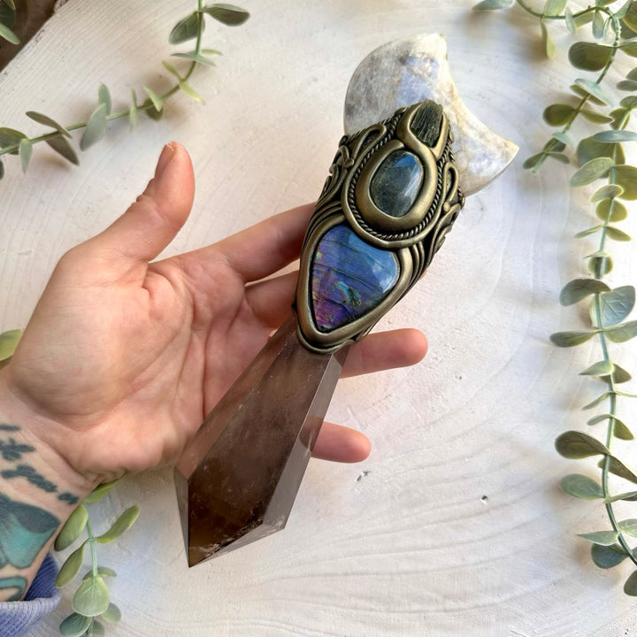 Healing Crystal Wand with Smoky Quartz, Moonstone Moon, Labradorite, Clear Topaz and Moldavite