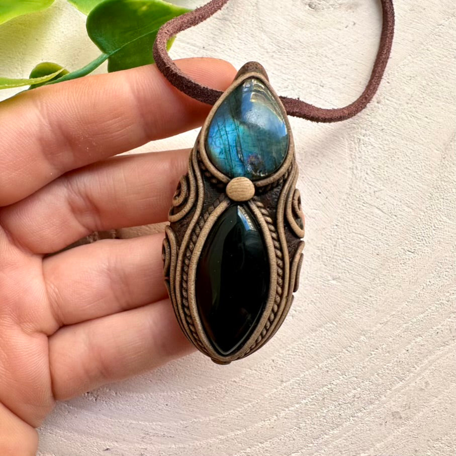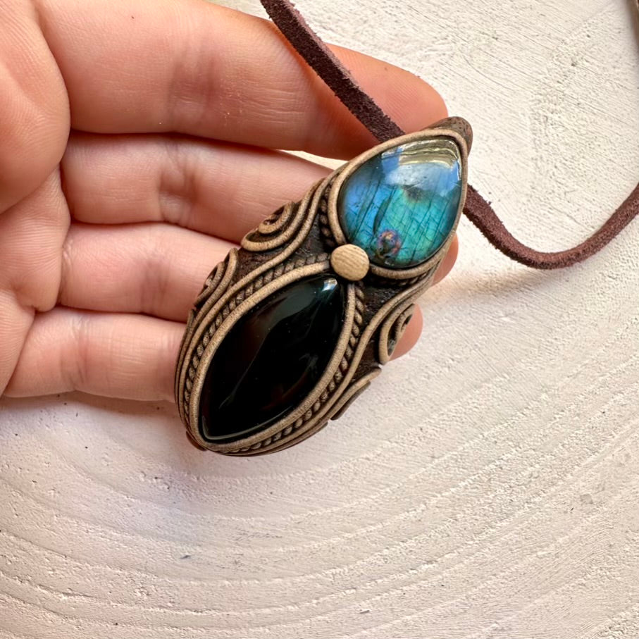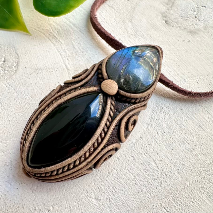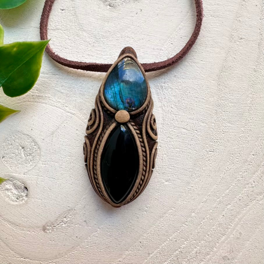 The Labradorite and Black Onyx Necklace is made with durable clay and it comes with adjustable leather cord.