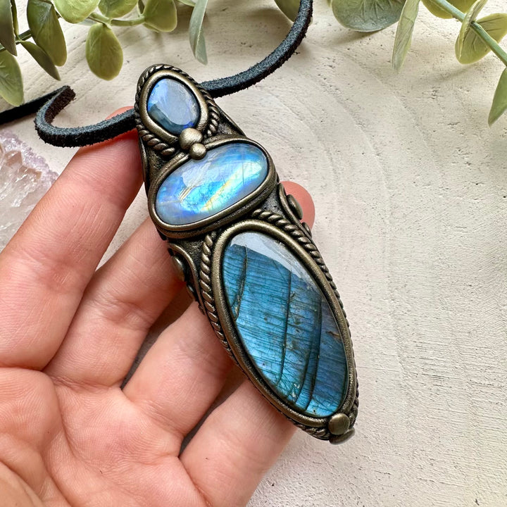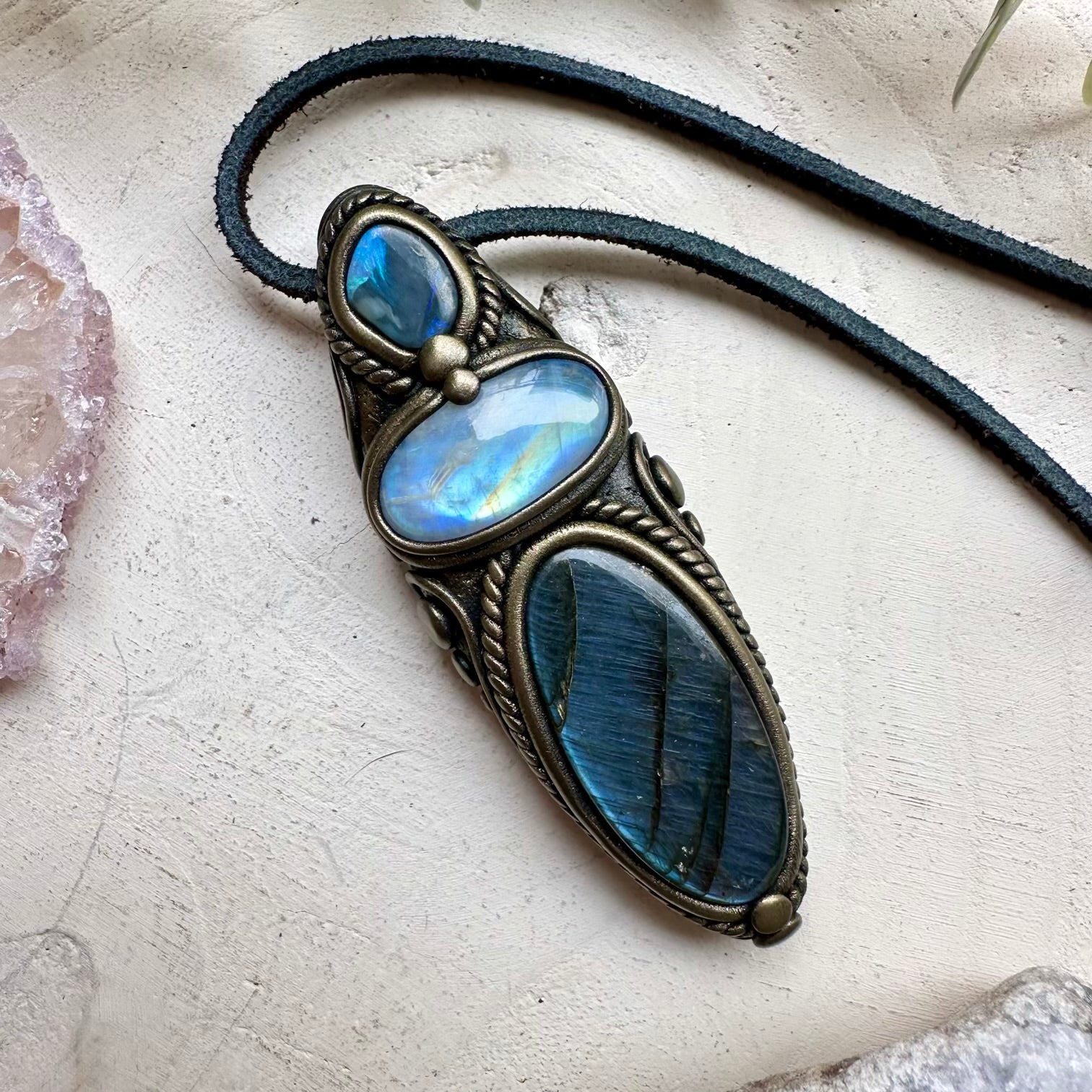 The Labradorite and Rainbow Moonstone and Black Australian Opal Pendant Necklace is made with durable clay and it comes with adjustable leather cord.