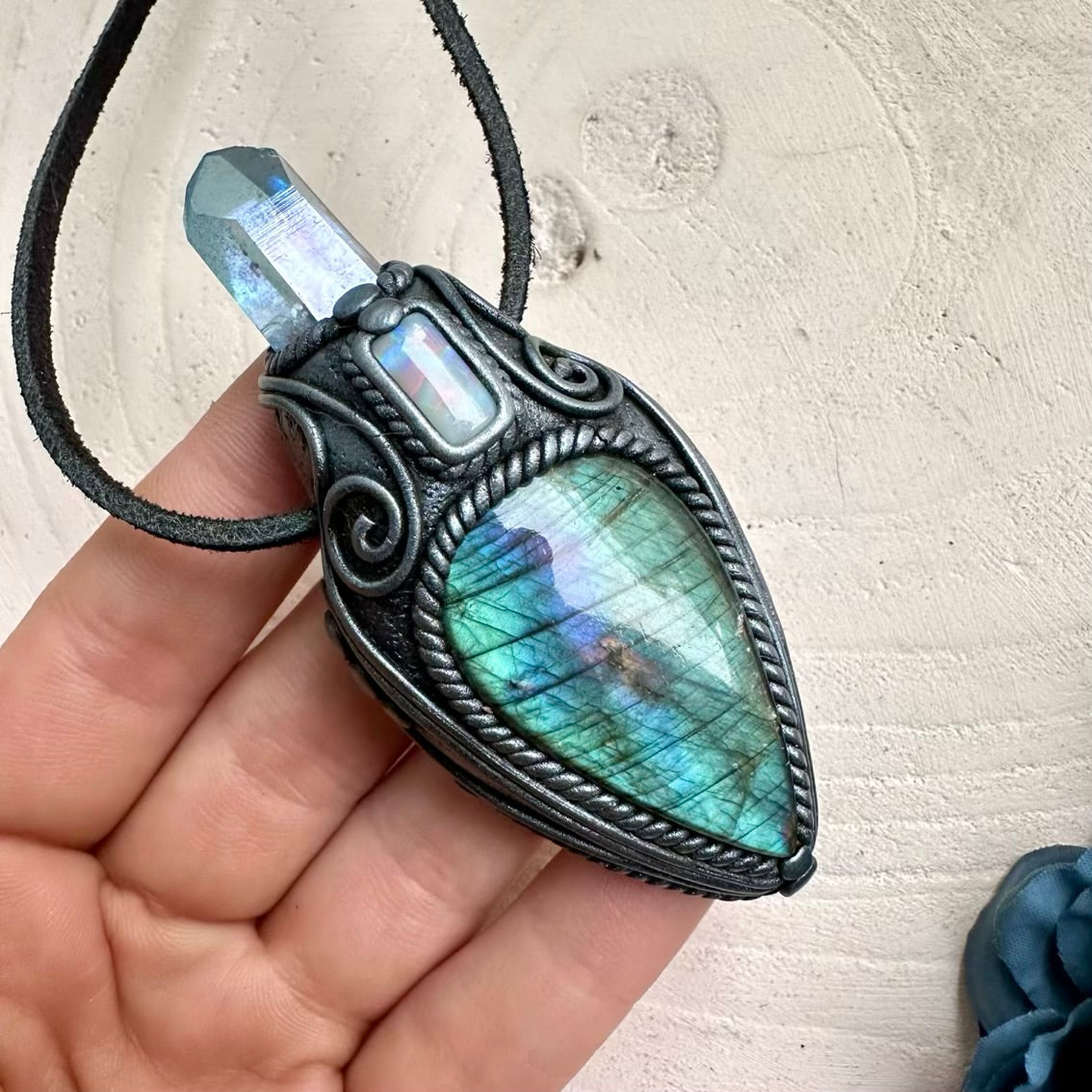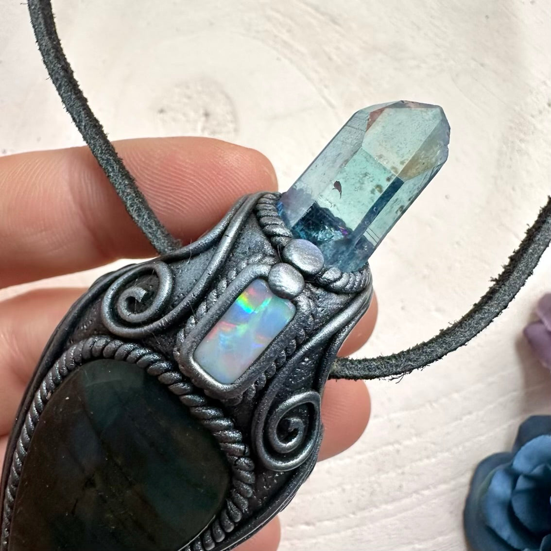 The Labradorite Aqua Aura Quartz and Australian Opal Pendant Necklace is made with durable clay and it comes with adjustable leather cord.