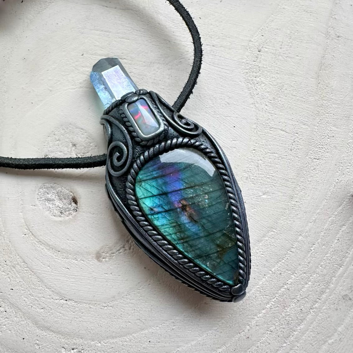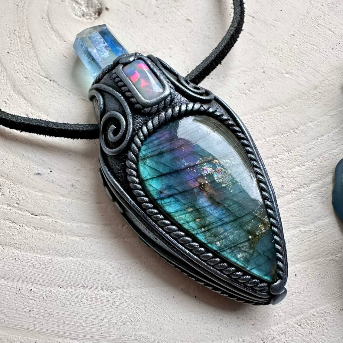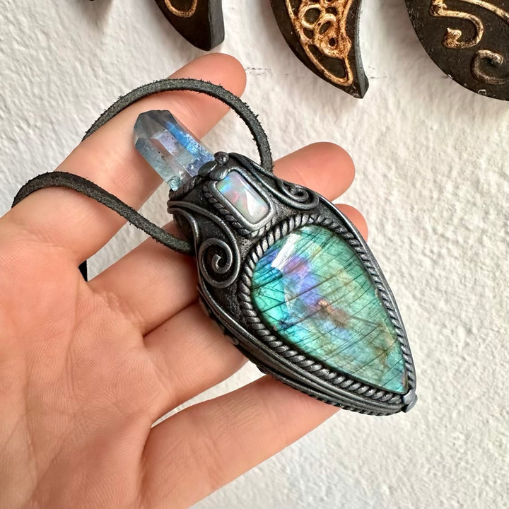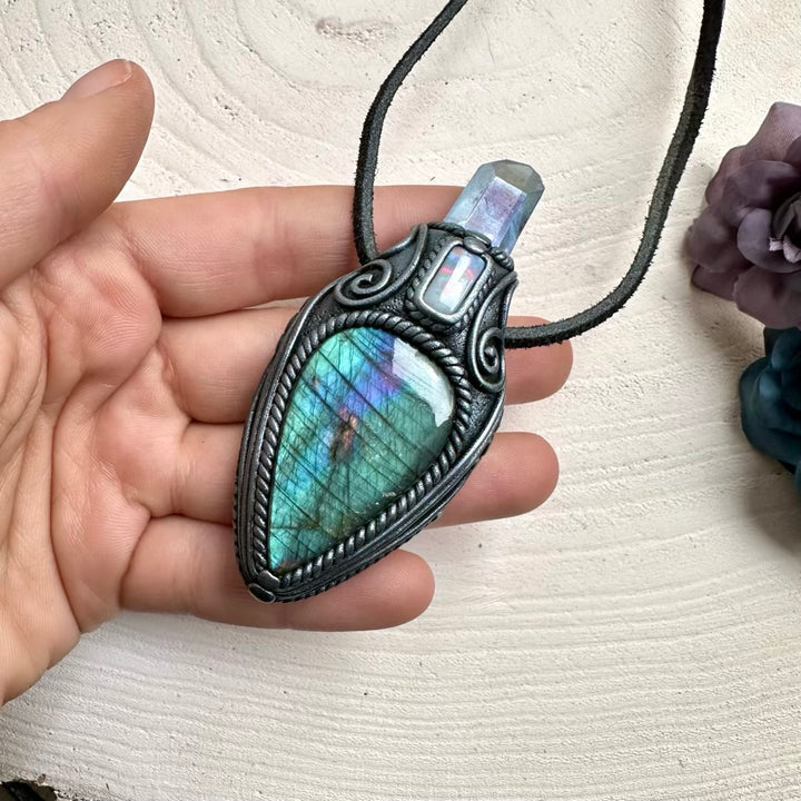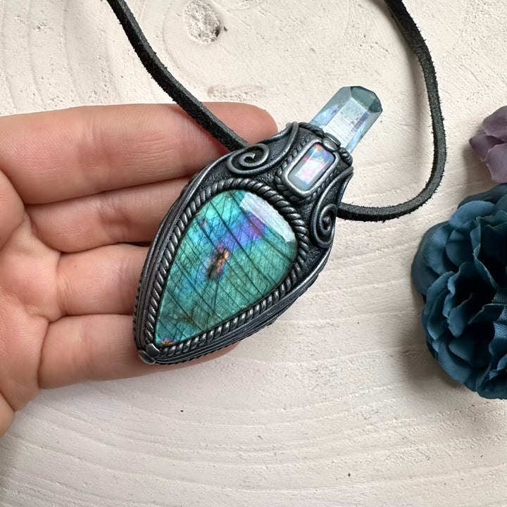The Labradorite Aqua Aura Quartz and Australian Opal Pendant Necklace isn’t just jewelry