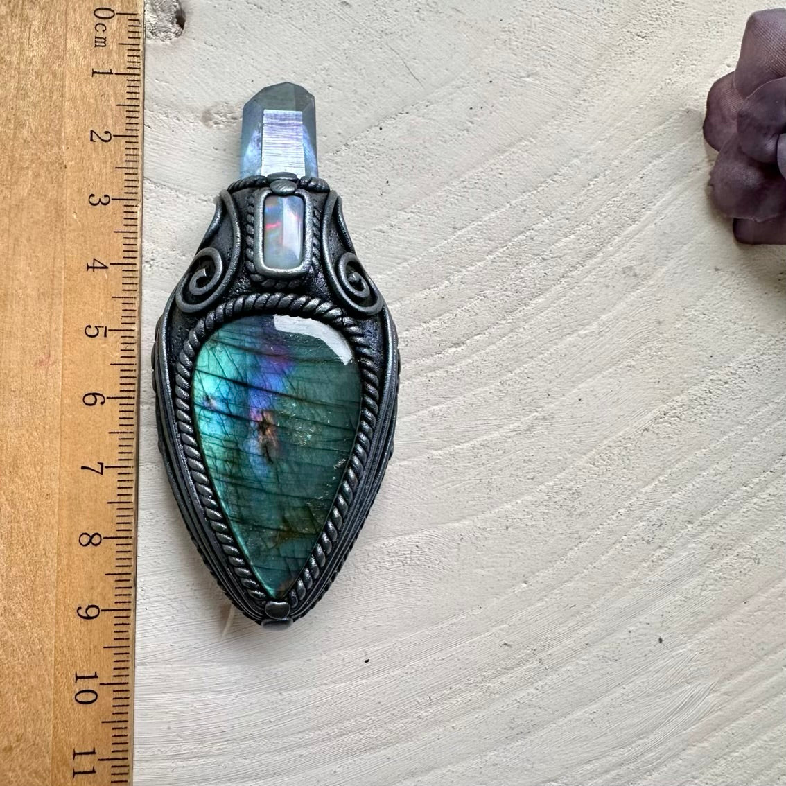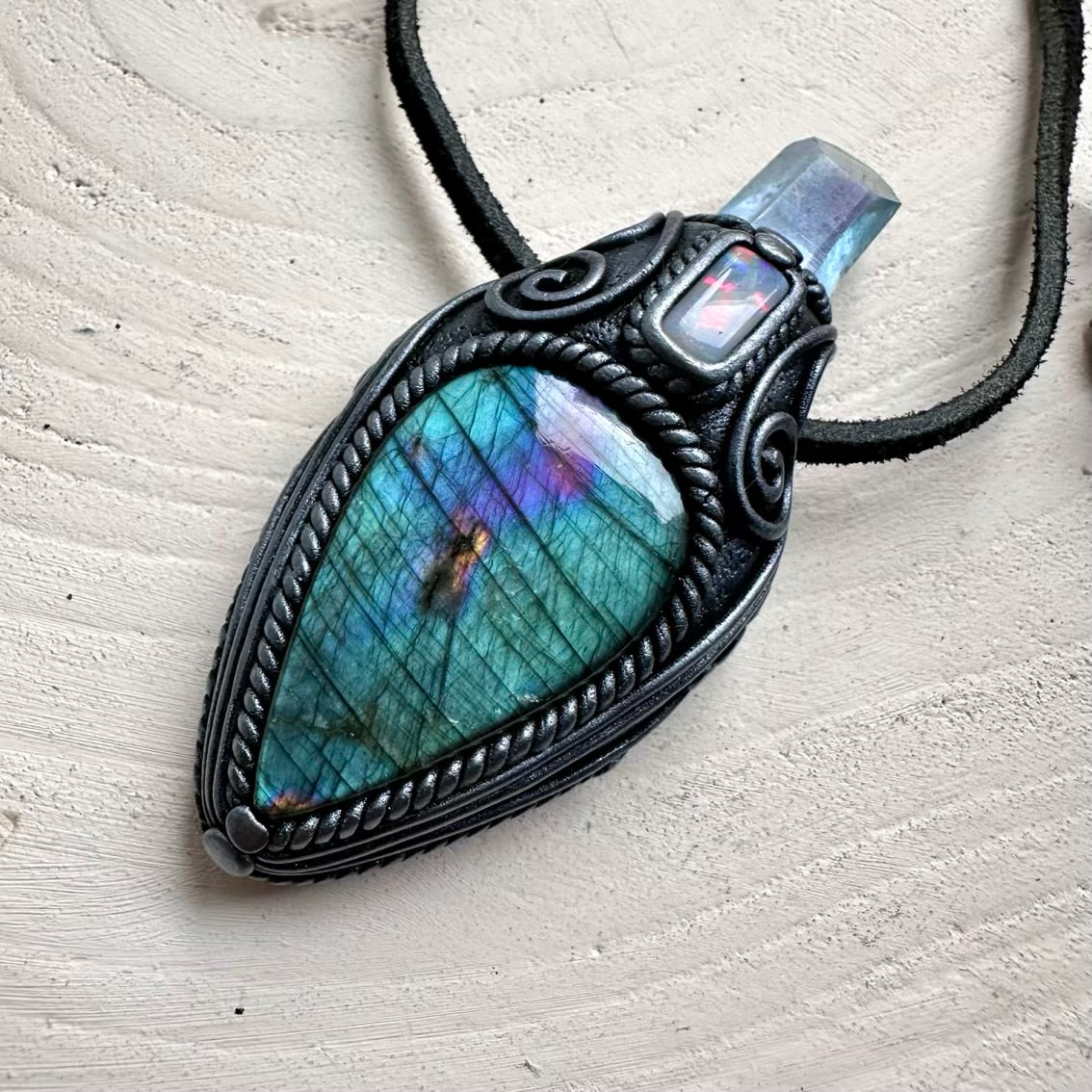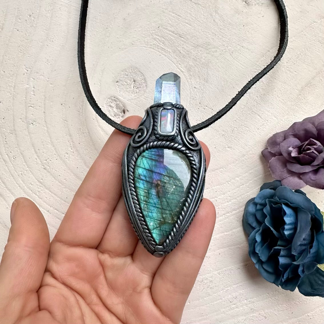 The Labradorite Aqua Aura Quartz and Australian Opal Pendant Necklace isn’t just jewelry