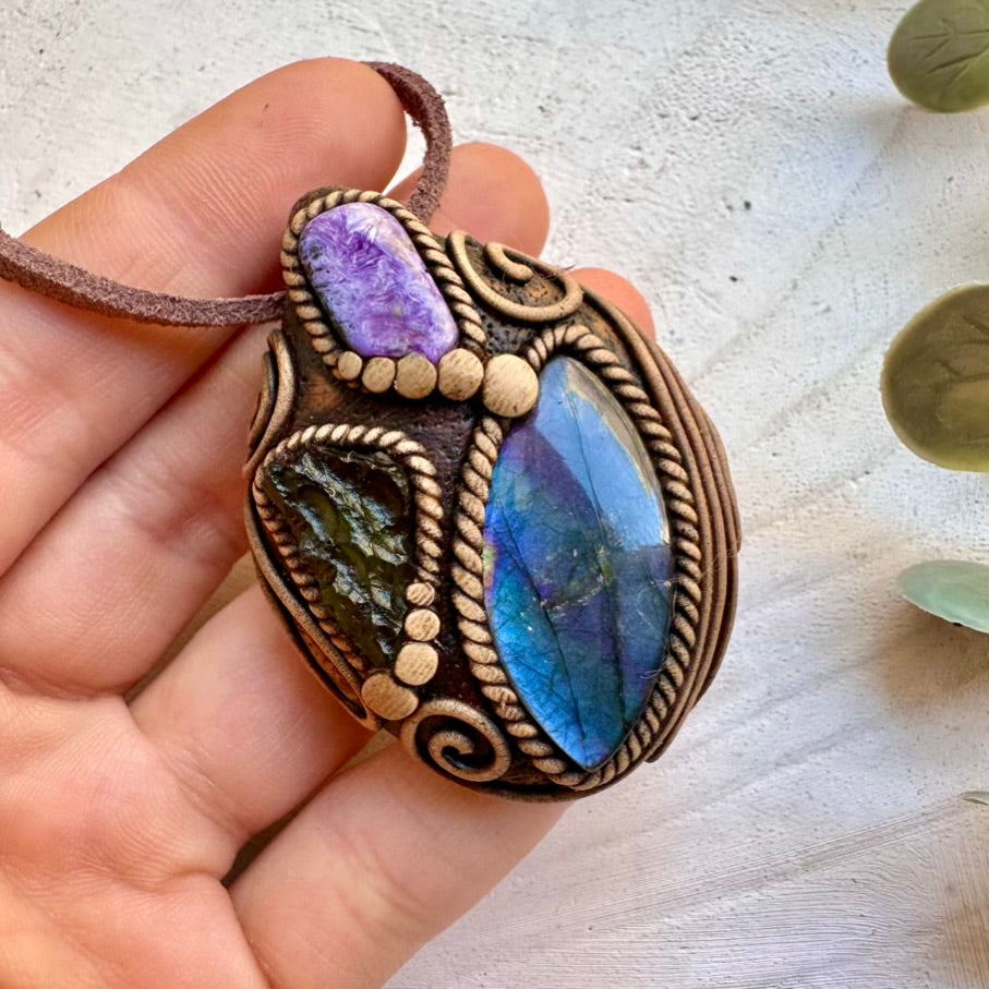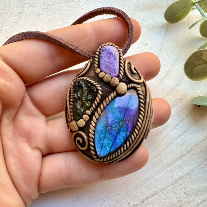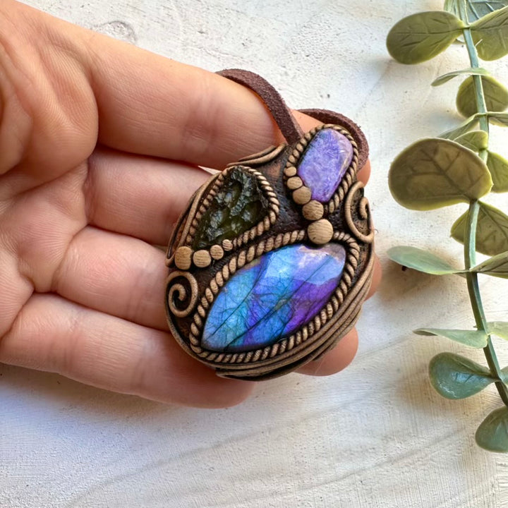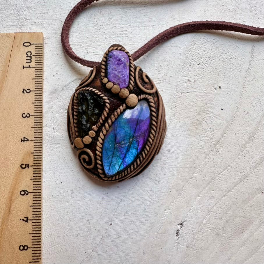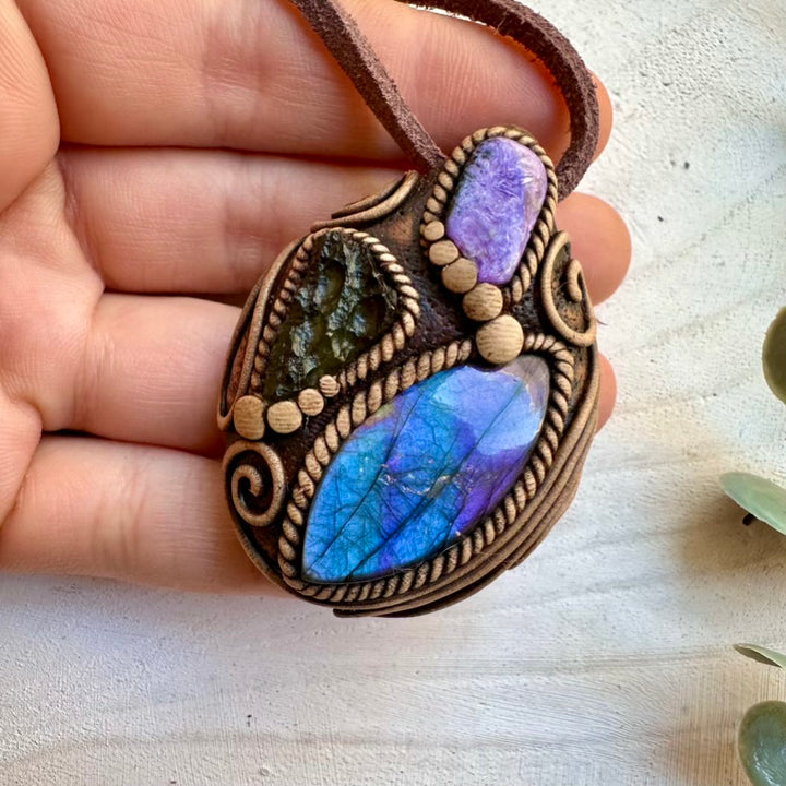 The Labradorite Charoite and Moldavite Necklace, Unisex Gemstone Pendant is made with durable clay and it comes with adjustable leather cord.