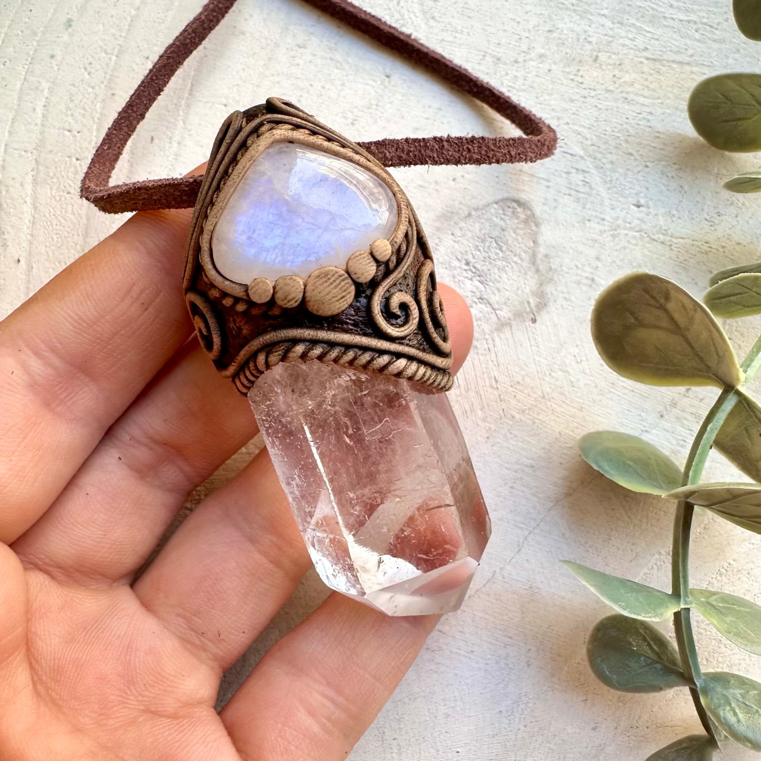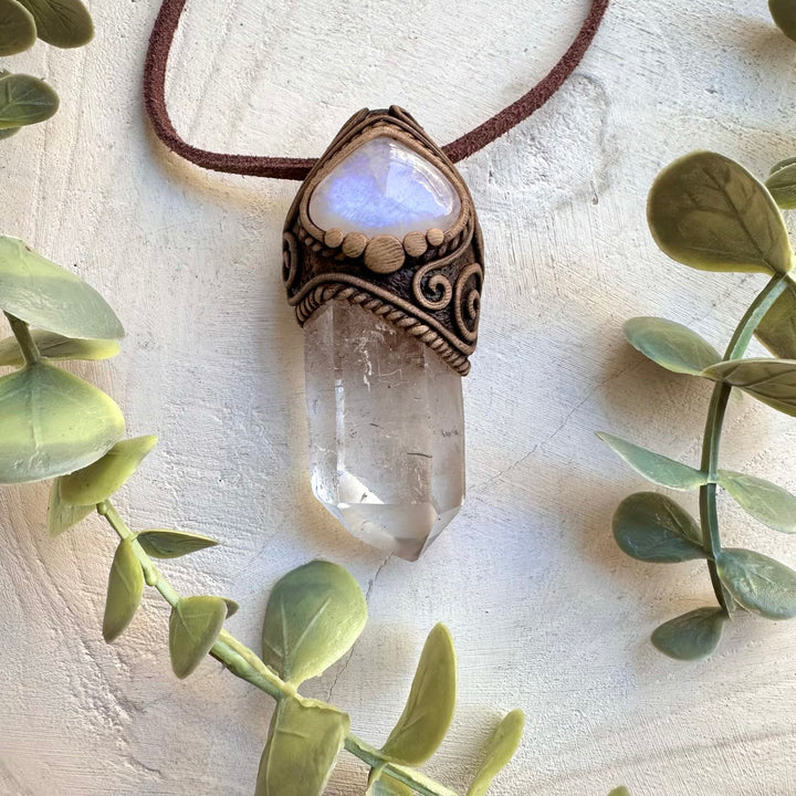 The Large Clear Quartz Point and Moonstone Necklace is made with durable clay and it comes with an adjustable leather cord.