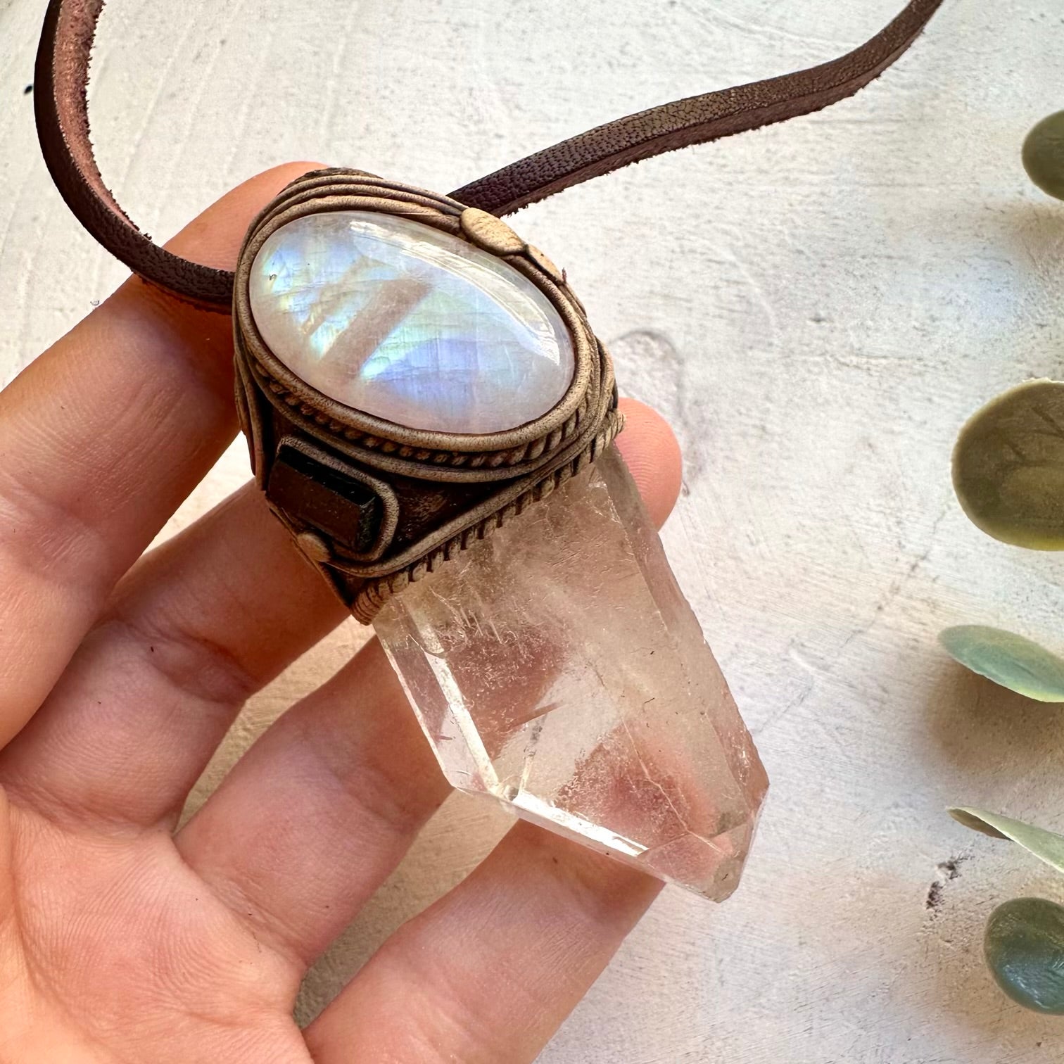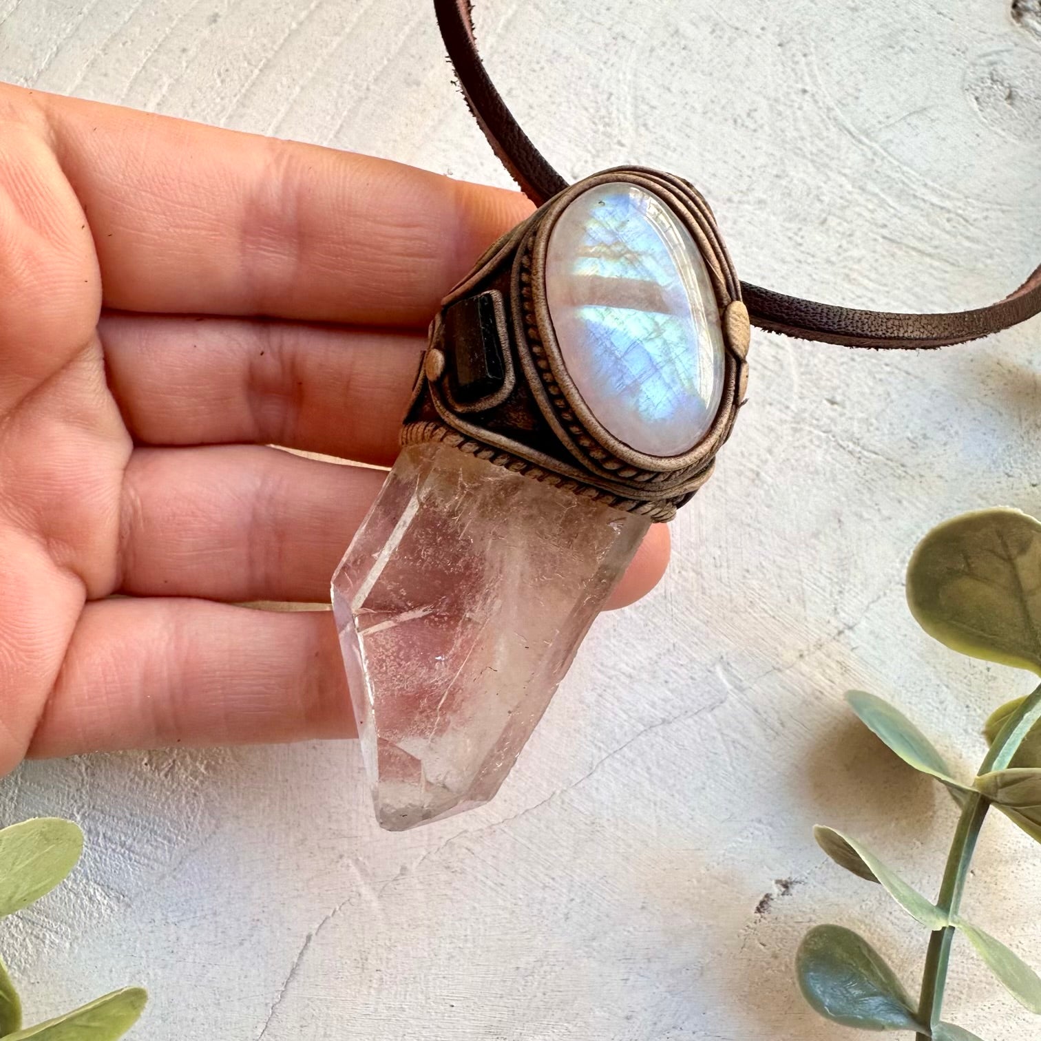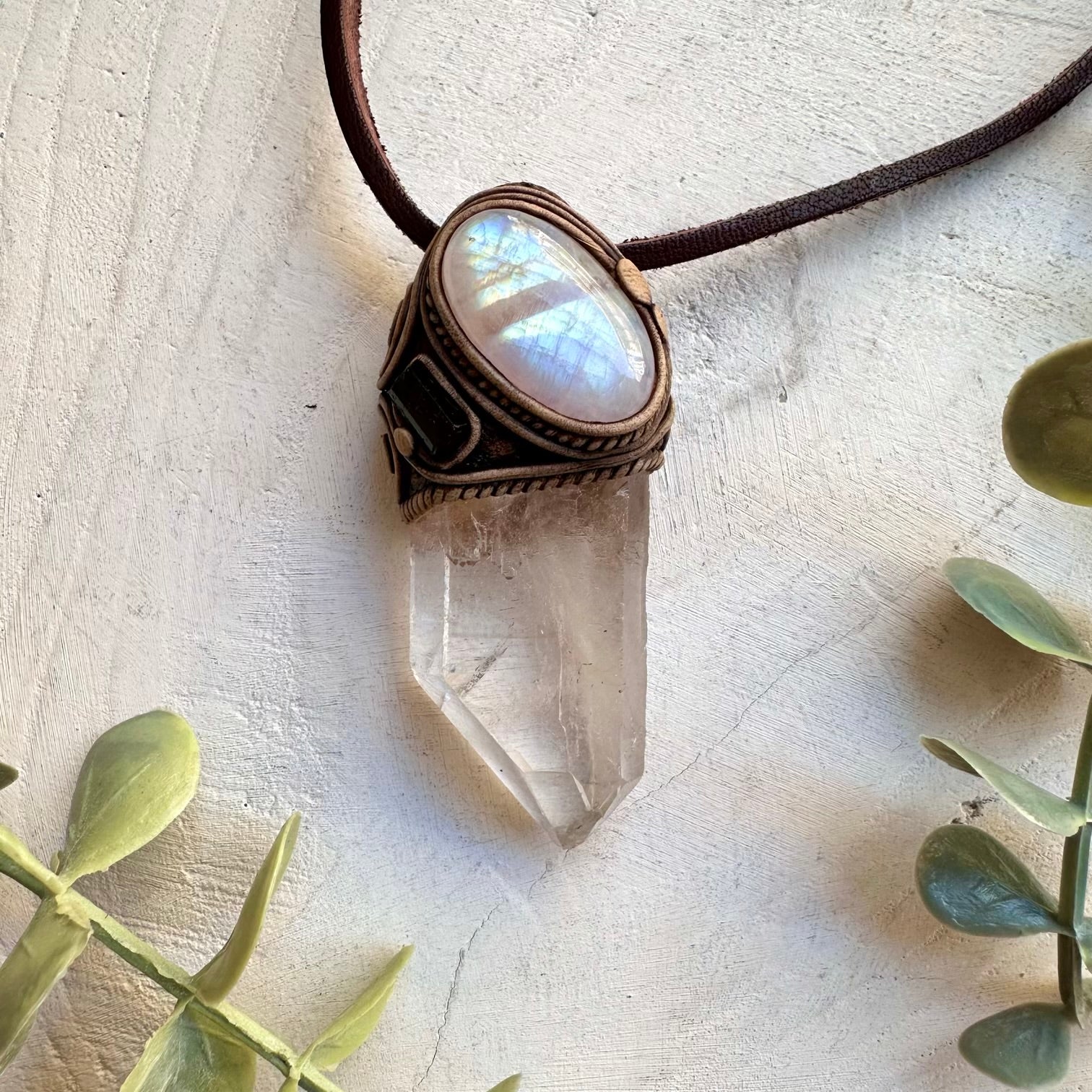The Large Clear Quartz Point with Rainbow Moonstone and Black Tourmaline Necklace is made with durable clay and it comes with adjustable leather cord.