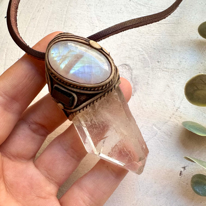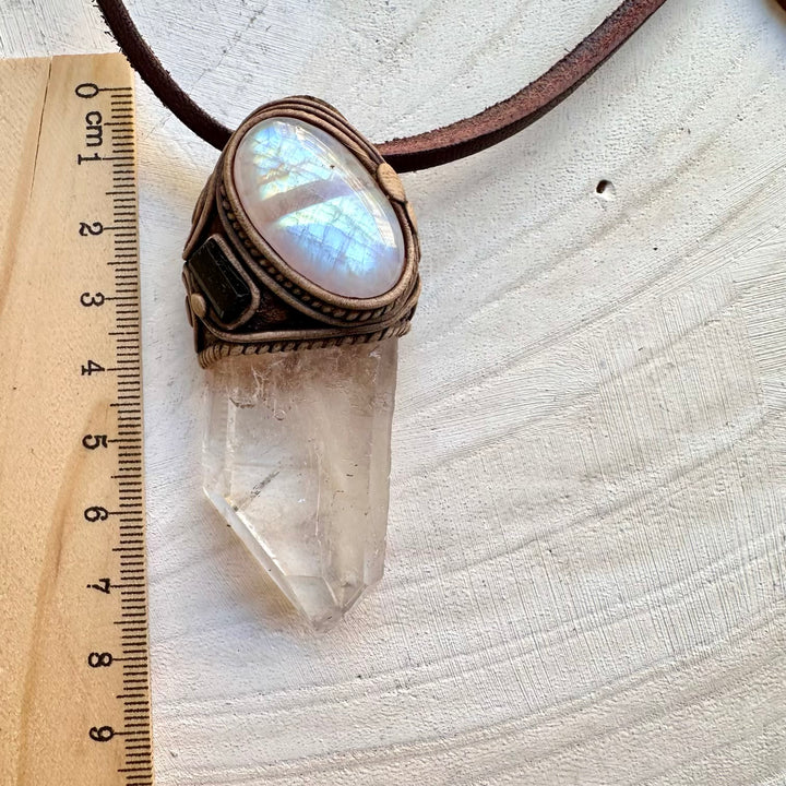 The Large Clear Quartz Point with Rainbow Moonstone and Black Tourmaline Necklace isn’t just jewelry