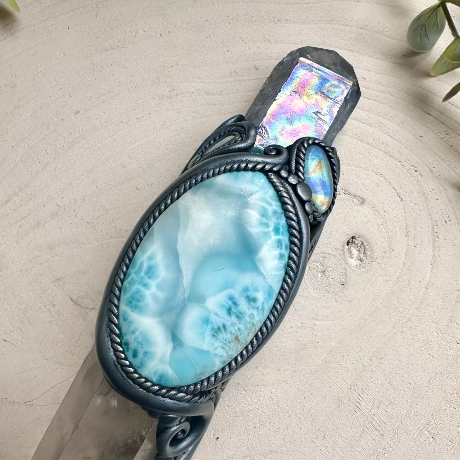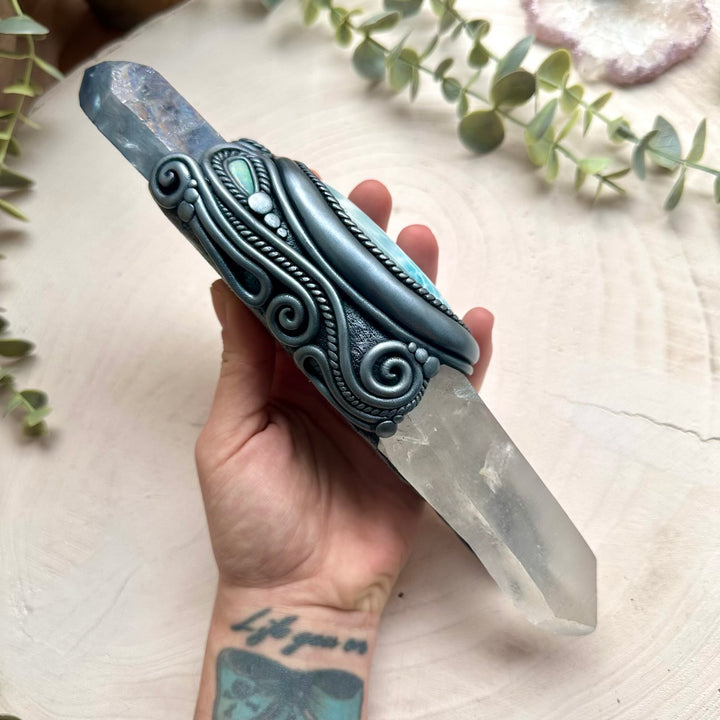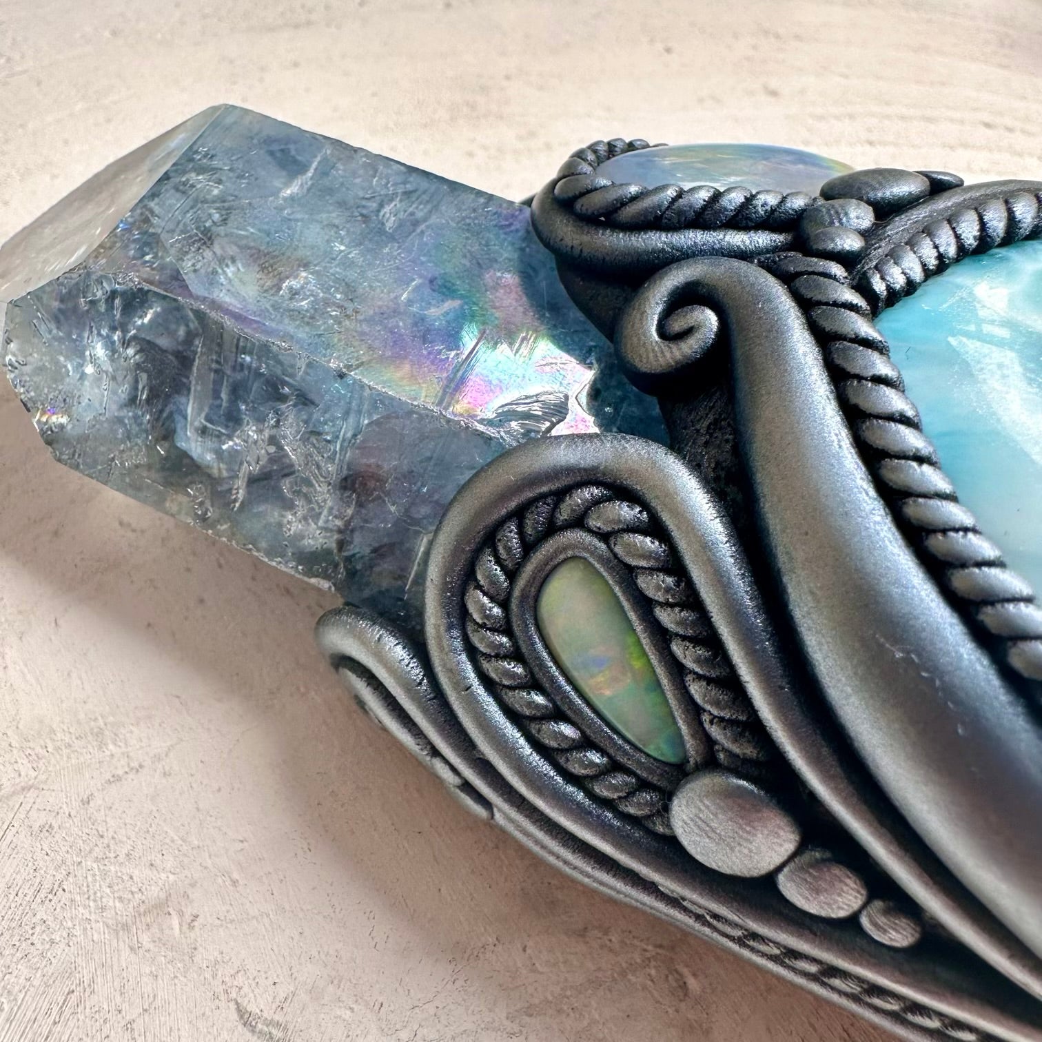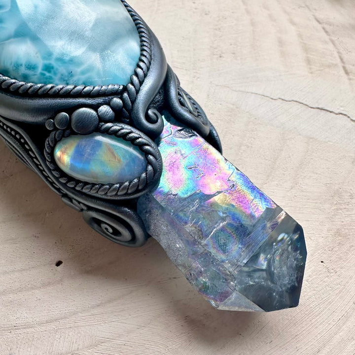 Fragile handcrafted elements. Polymer clay details, handcrafted mounts, metal components, and crystal settings can break if bent, dropped, or exposed to force. Please handle with care.