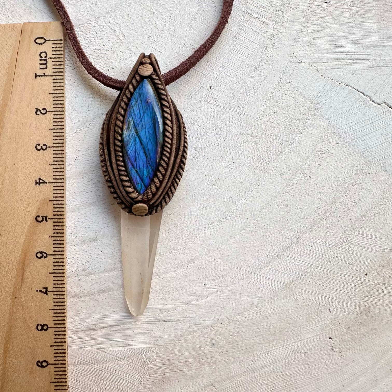 The Lemurian Seed Quartz and Labradorite Pendant Necklace is made with durable clay and it comes with adjustable leather cord.
