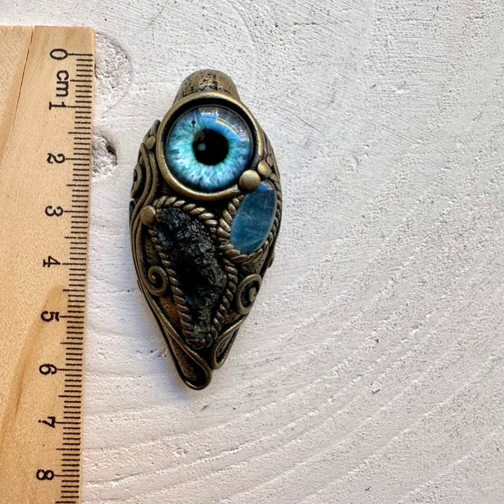 Handmade Moldavite crystal and Aquamarine protective eye pendant, ethically sourced spiritual healing necklace talisman.