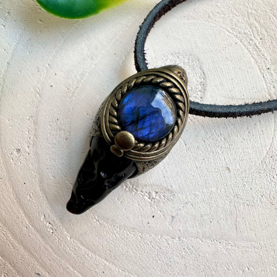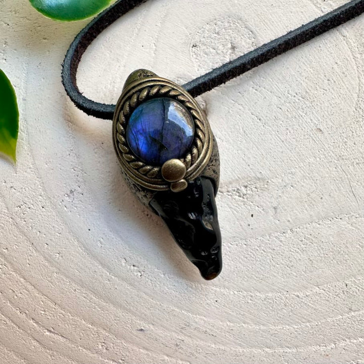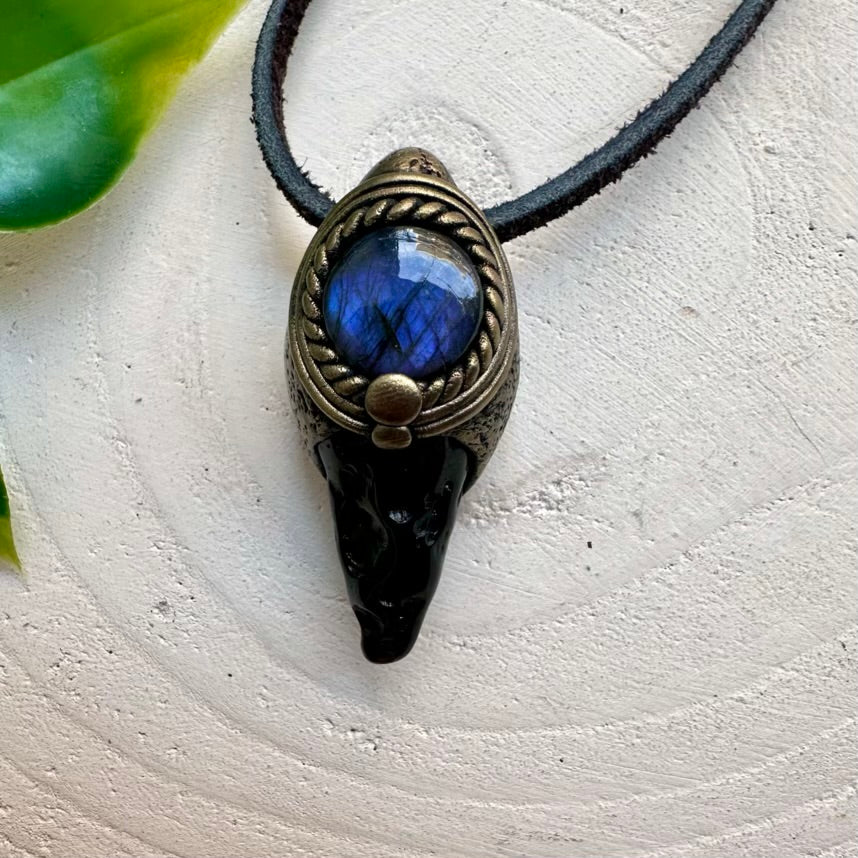 The Polished Black Tektite and Labradorite Pendant Necklace is made with durable clay and it comes with adjustable leather cord.