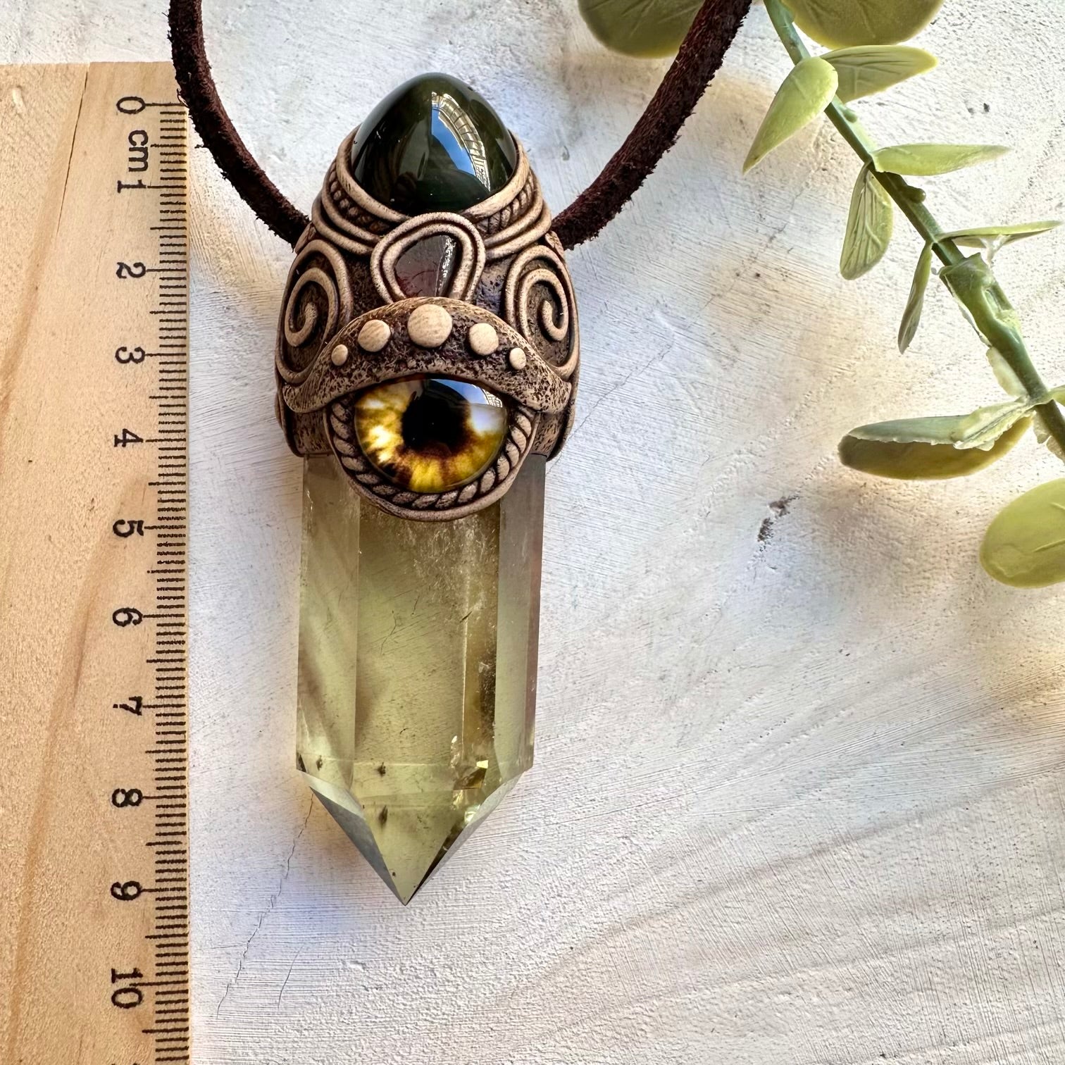 The Polished Citrine with Rainbow Obsidian, Red Garnet and Eye Wand / Pendant is made with durable clay and it comes with adjustable leather cord.