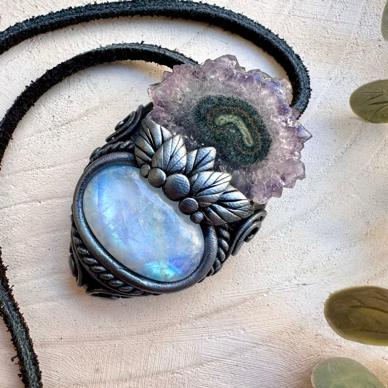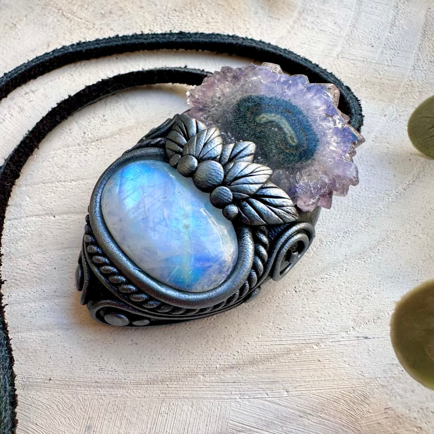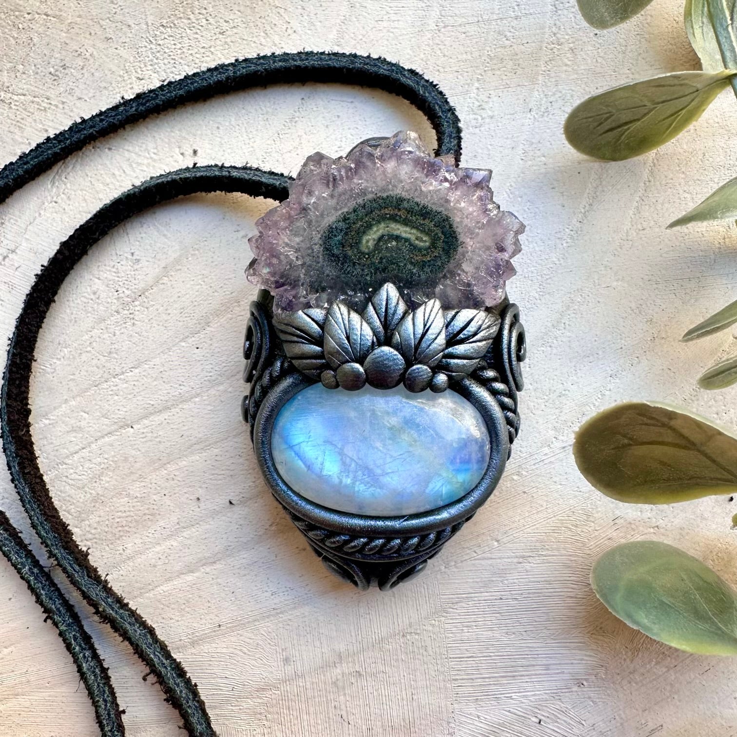 The Rainbow Moonstone and Amethyst Stalactite Necklace is made with durable clay and it comes with adjustable leather cord.