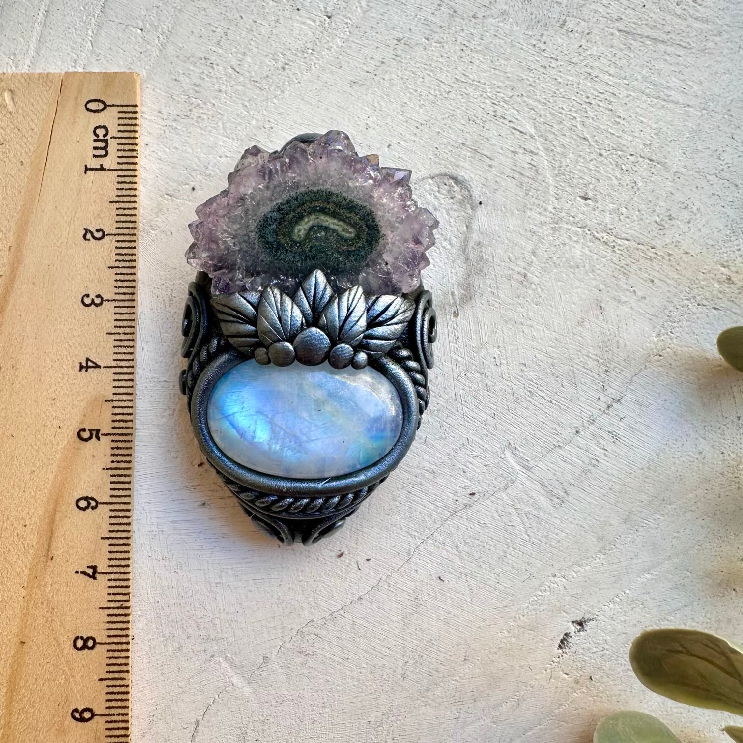 Natural rainbow moonstone paired with amethyst stalactite