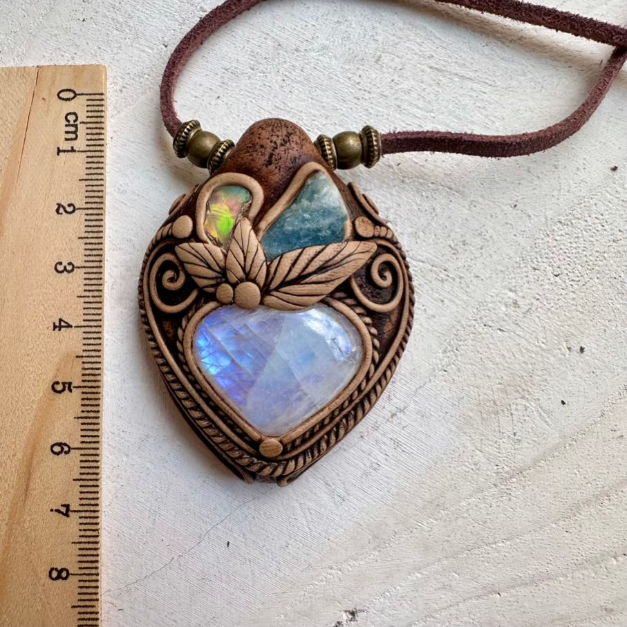 The Rainbow Moonstone with Raw Aquamarine and Raw Ethiopian Opal Necklace is made with durable clay and it comes with an adjustable leather cord.