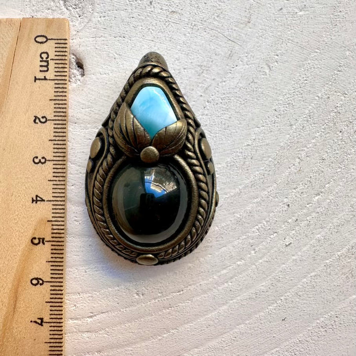 Ethically sourced Rainbow Obsidian with ocean-blue Larimar pendant, wearable spiritual protection amulet handmade with love.