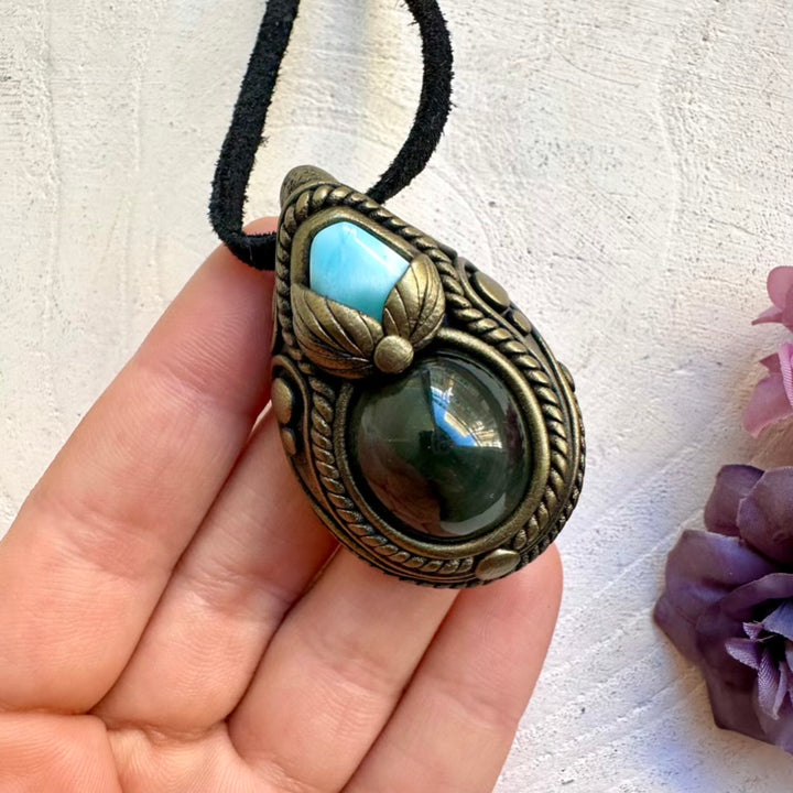 Handmade Rainbow Obsidian with luminous Larimar pendant necklace, calming and protective spiritual crystal jewelry talisman.