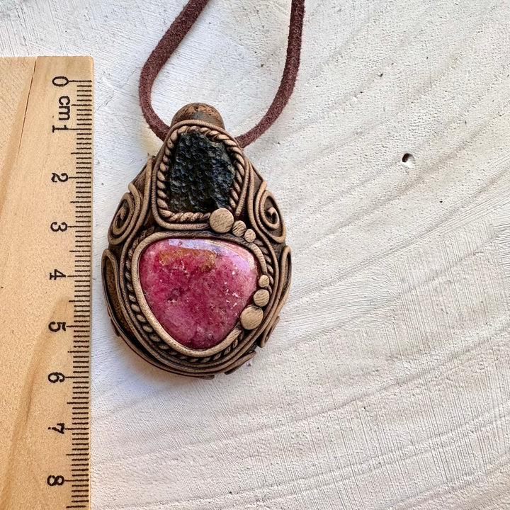 The Rhododnite and Moldavite Pendant Necklace is made with durable clay and it comes with adjustable leather cord.
