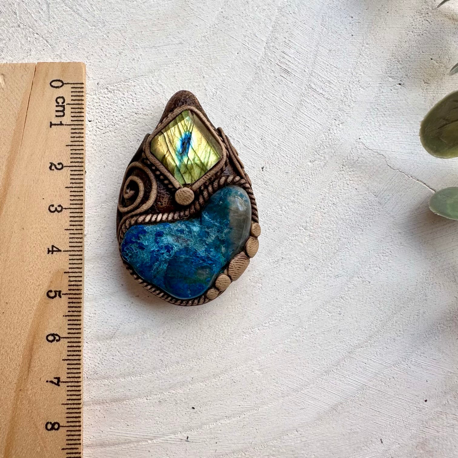 The Shattuckite and Labradorite Pendant Necklace is made with durable clay and it comes with an adjustable leather cord.