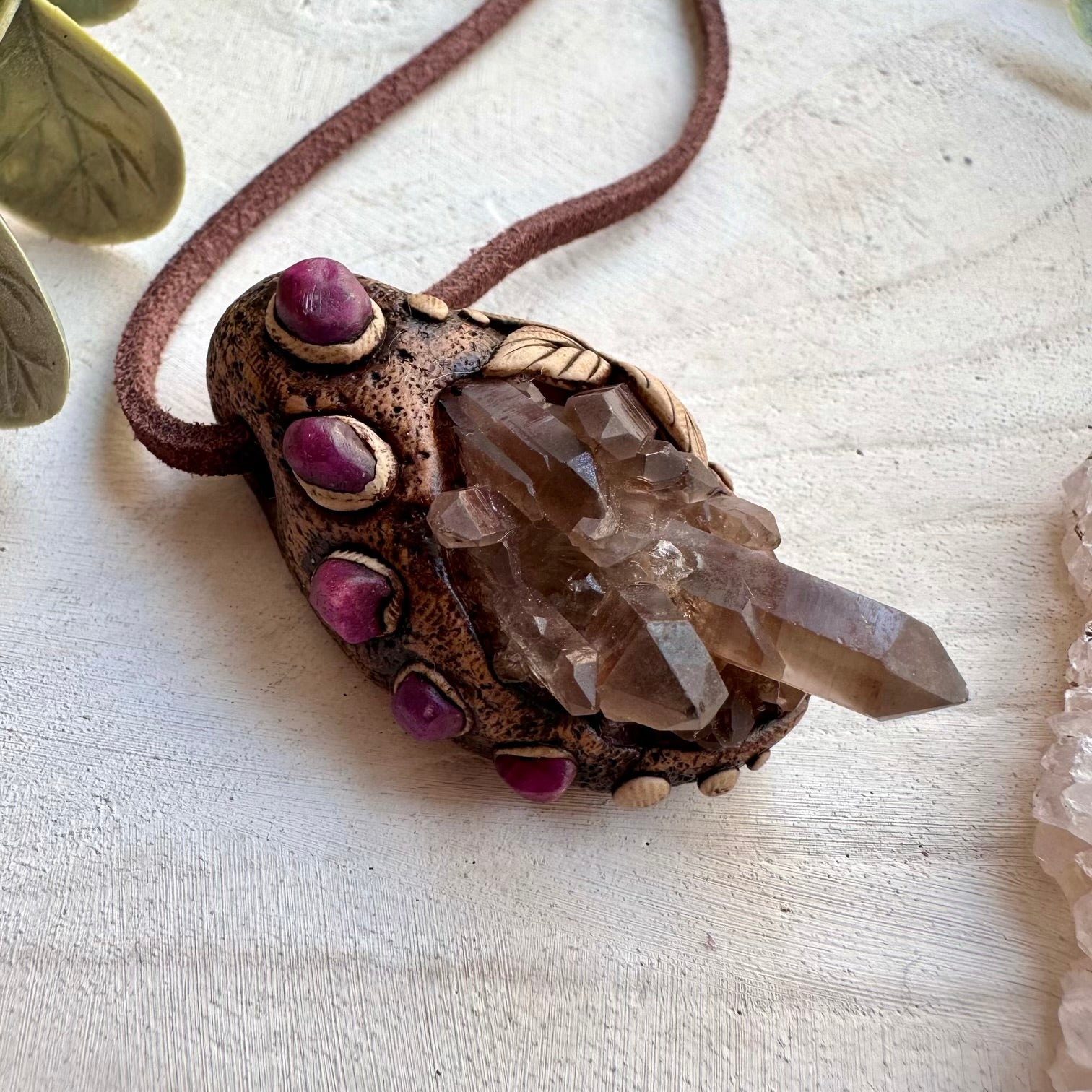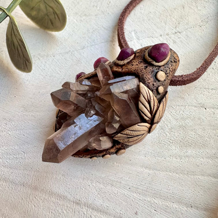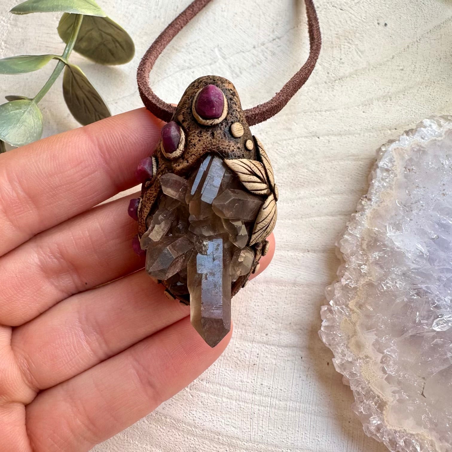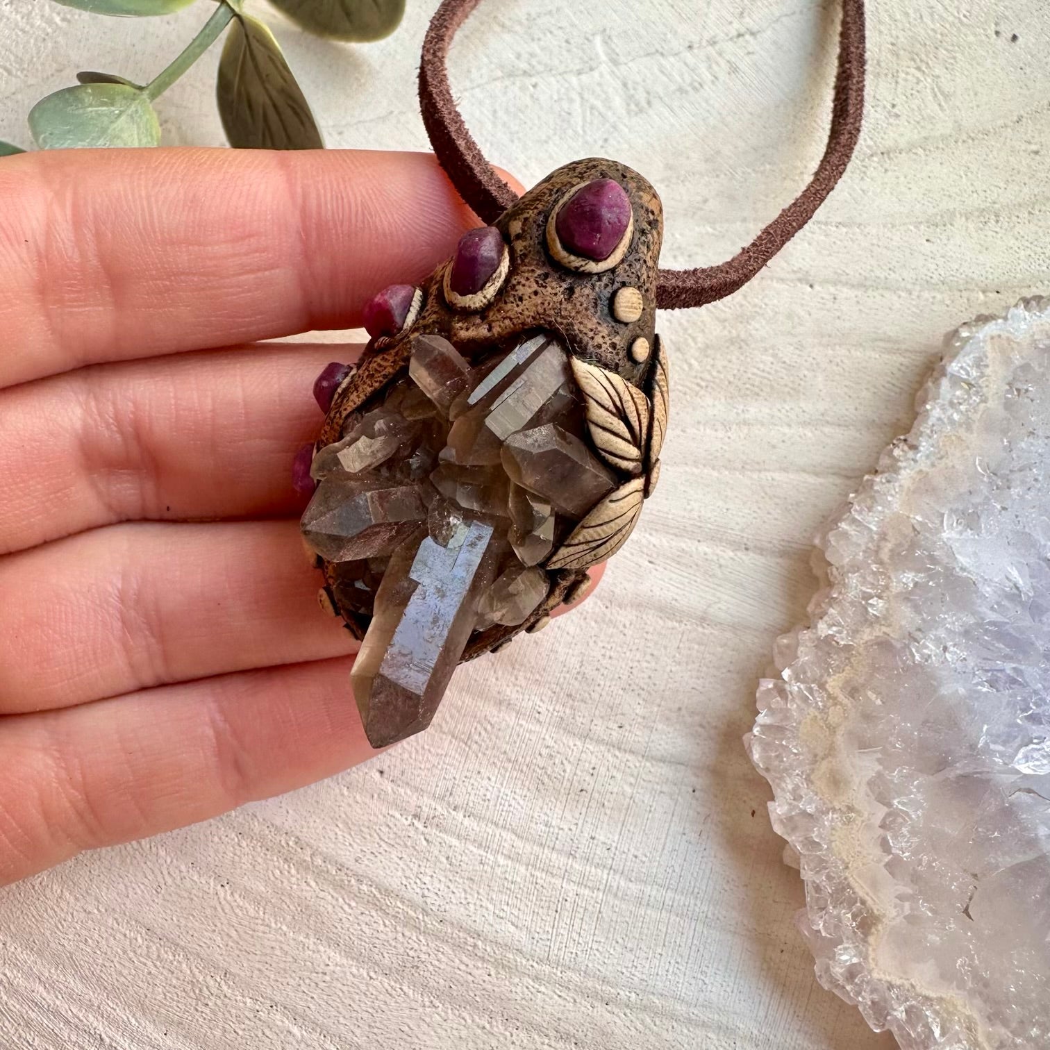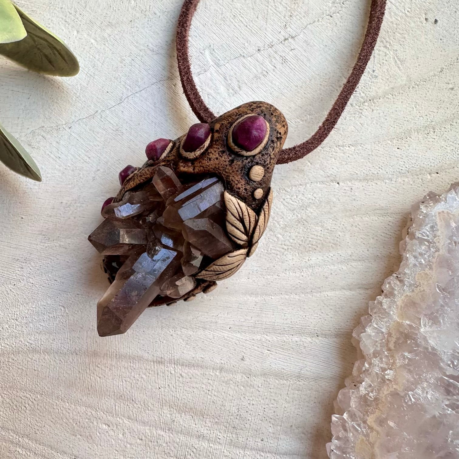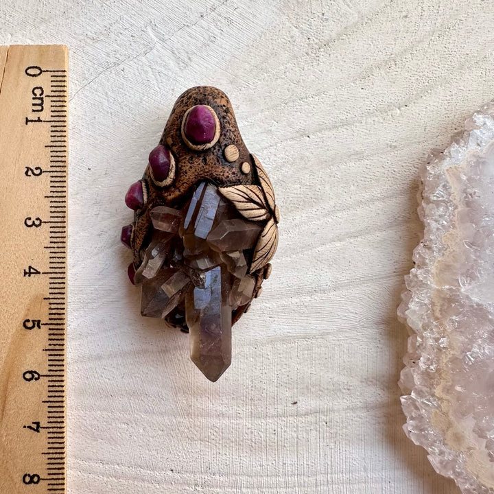 Fragile handcrafted elements. Polymer clay details, handcrafted mounts, metal components, and crystal settings can break if bent, dropped, or exposed to force. Please handle with care.