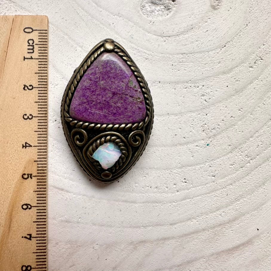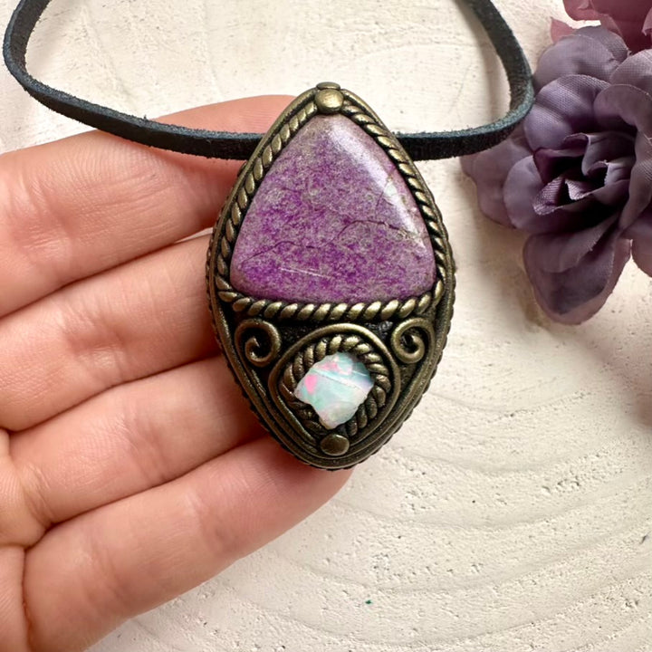 One-of-a-kind Stichtite and raw Ethiopian Opal pendant, wearable metaphysical energy tool jewelry.