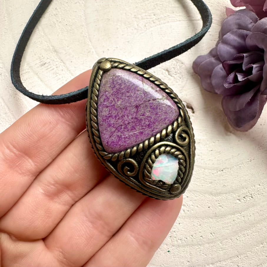 Spiritual imperfect raw Ethiopian Opal flash with soothing Stichtite crystal energy, handcrafted talisman necklace.