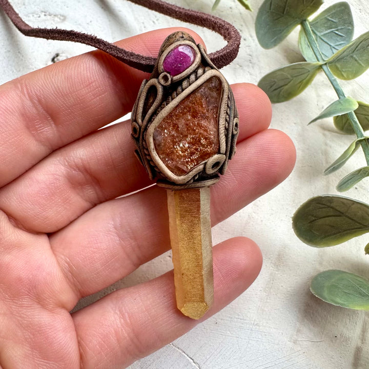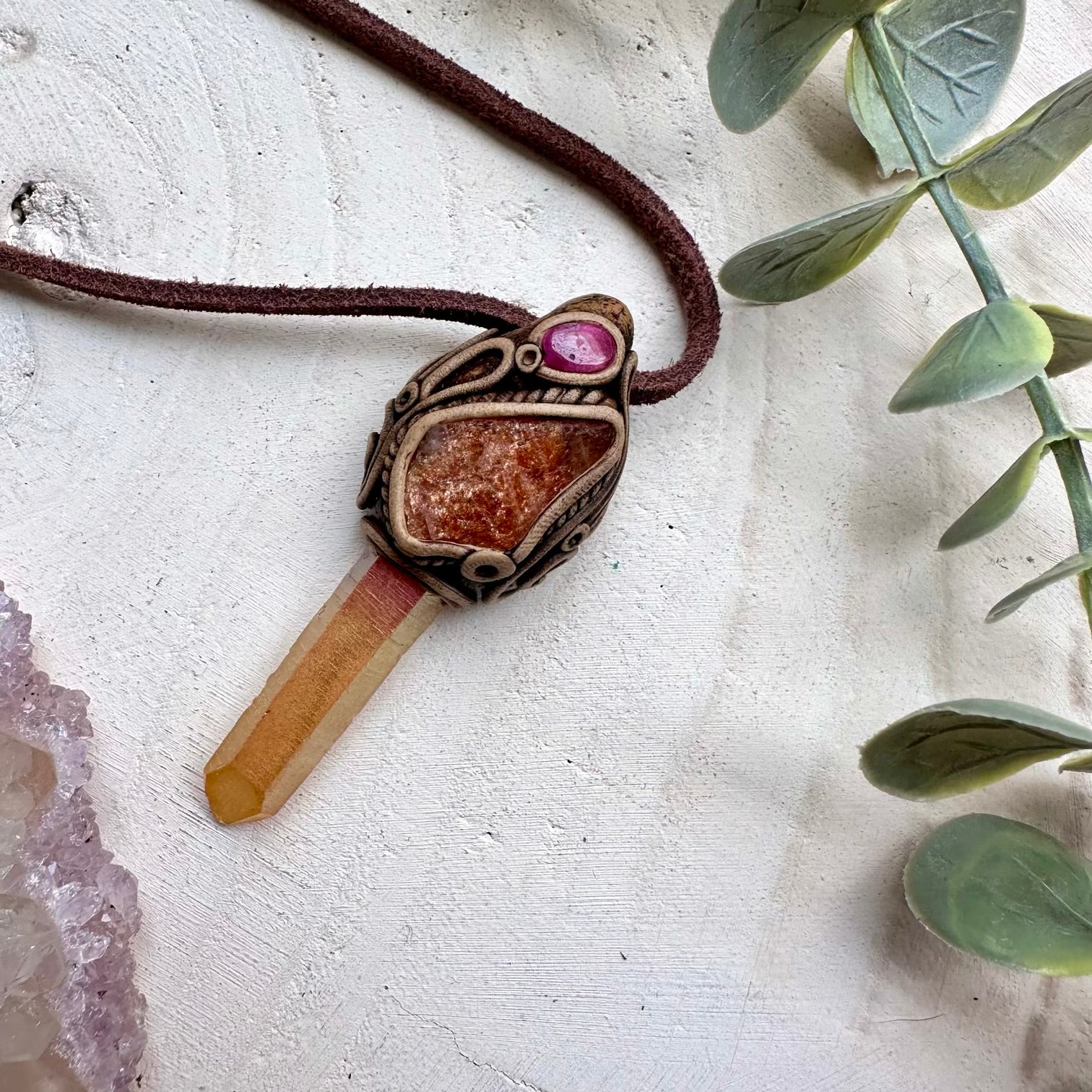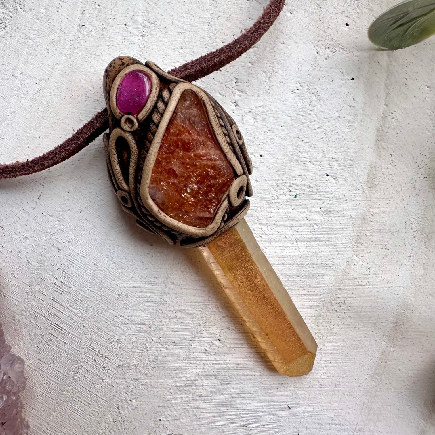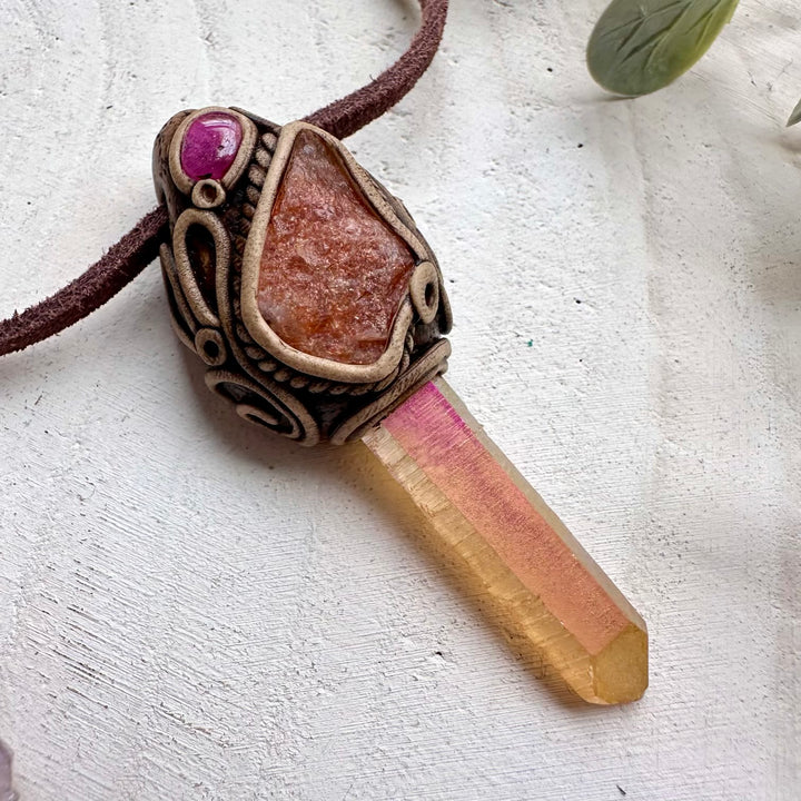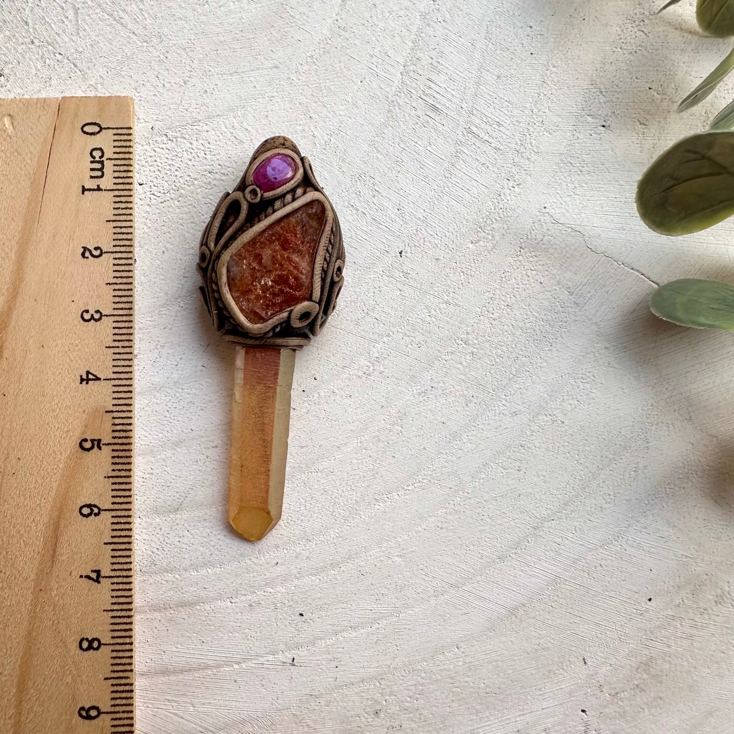 Fragile handcrafted elements. Polymer clay details, handcrafted mounts, metal components, and crystal settings can break if bent, dropped, or exposed to force. Please handle with care.