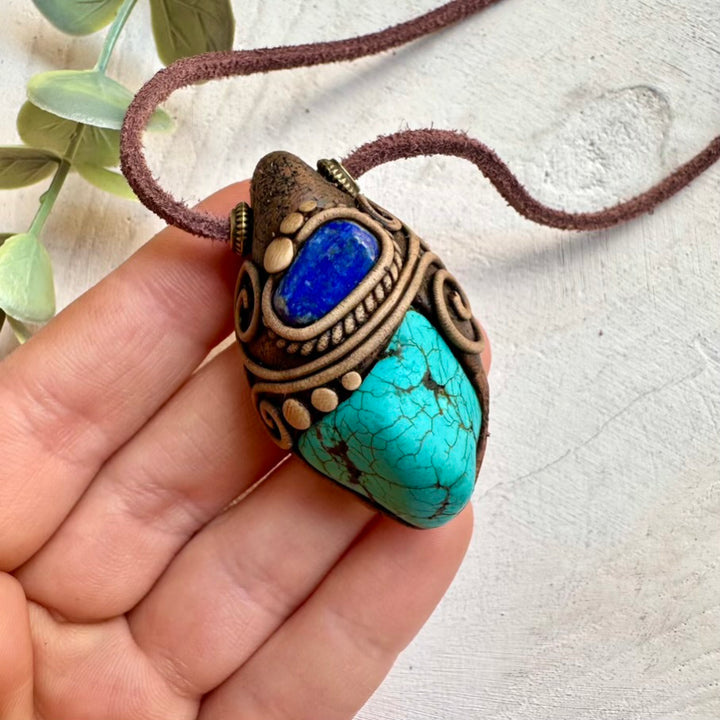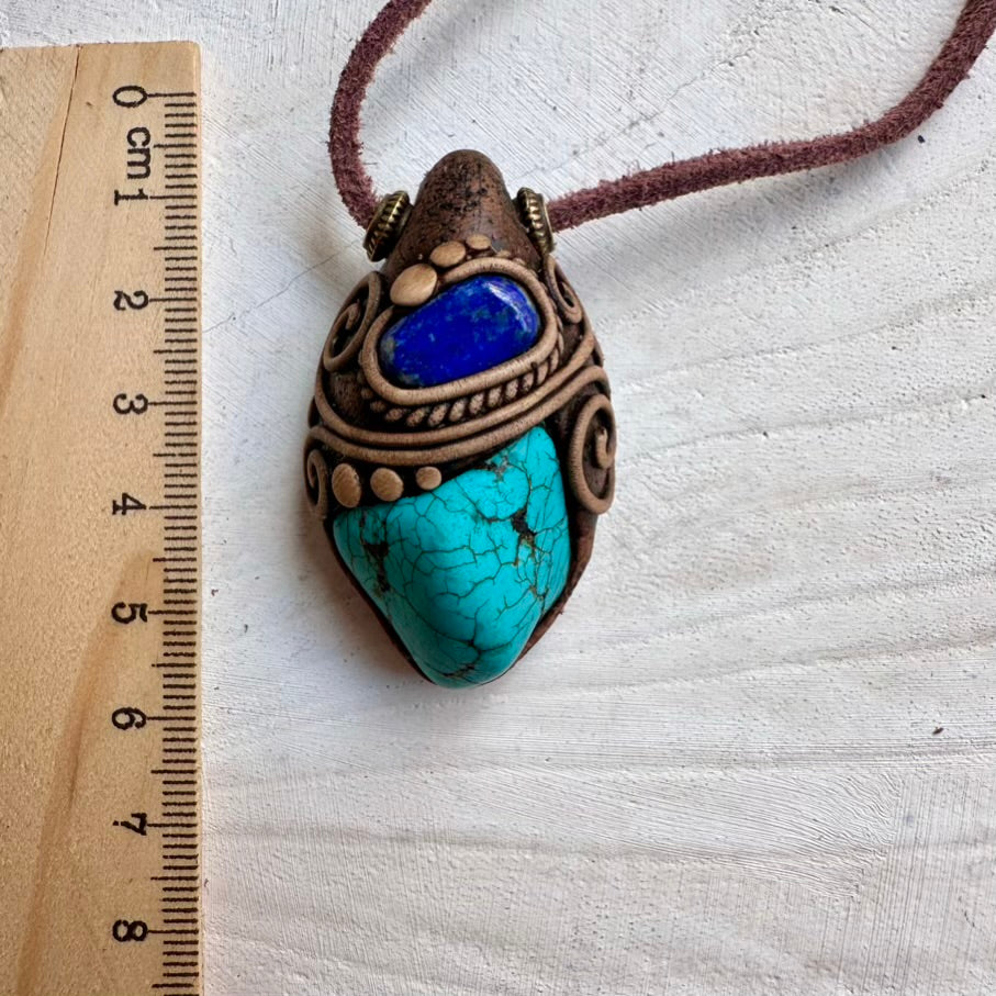 Natural turquoise paired with lapis lazuli in a handmade pendant