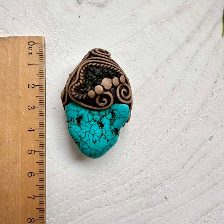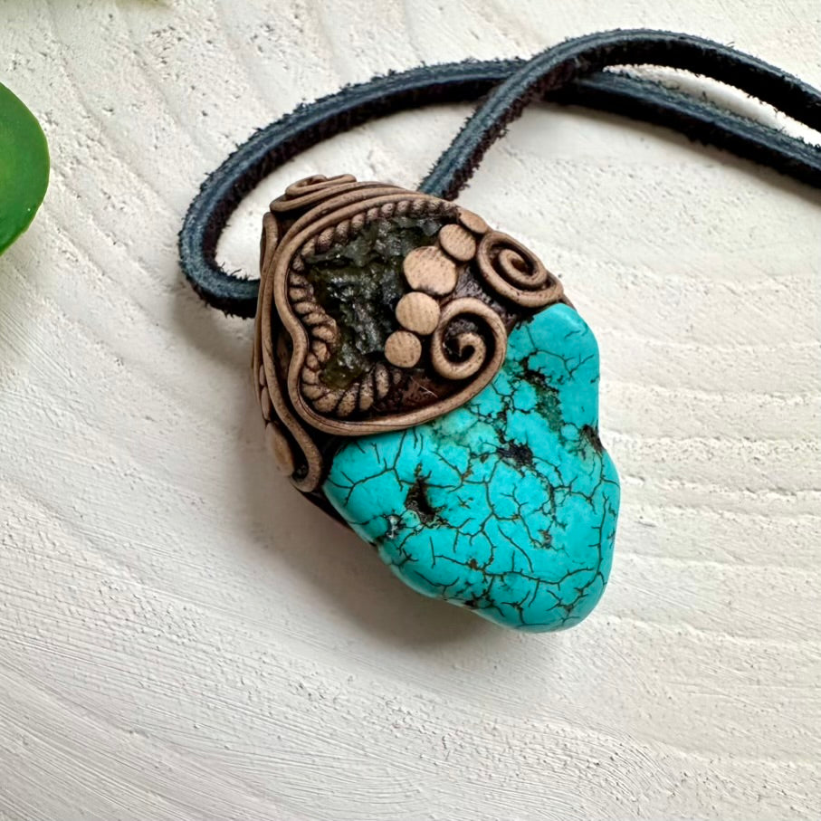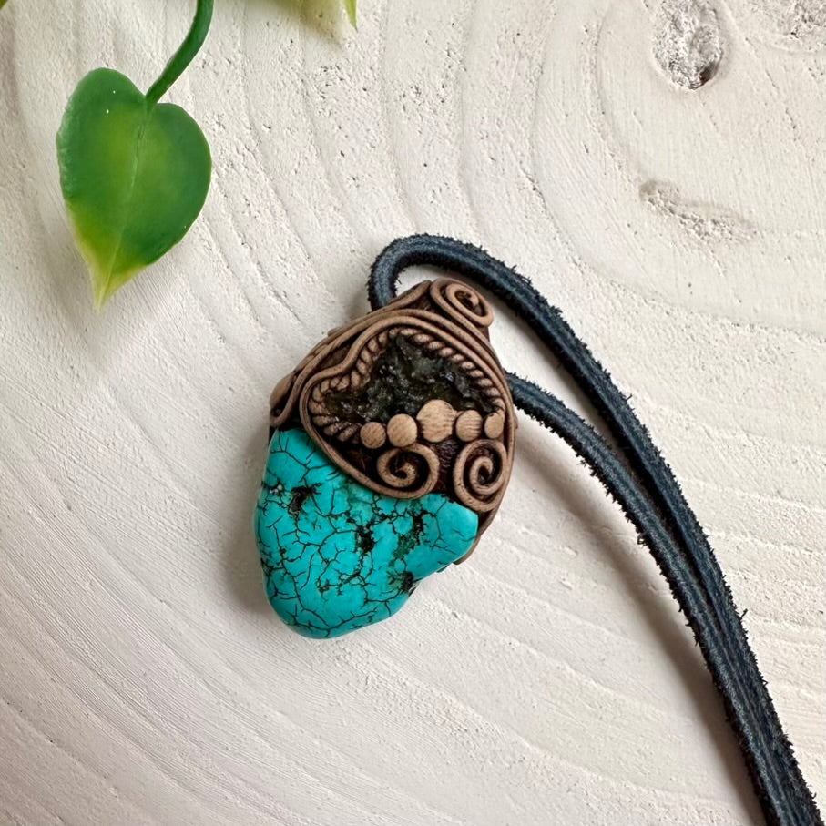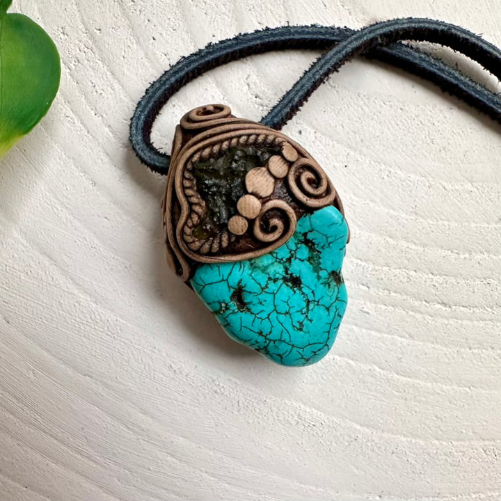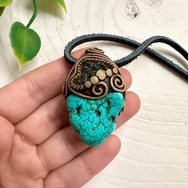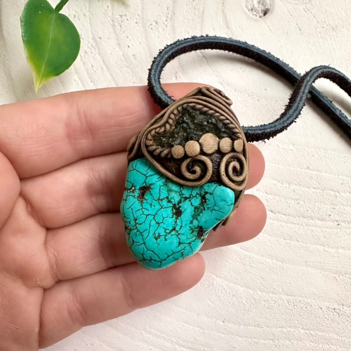 The Turquoise and Moldavite Pendant Necklace is made with durable clay and it comes with adjustable leather cord.