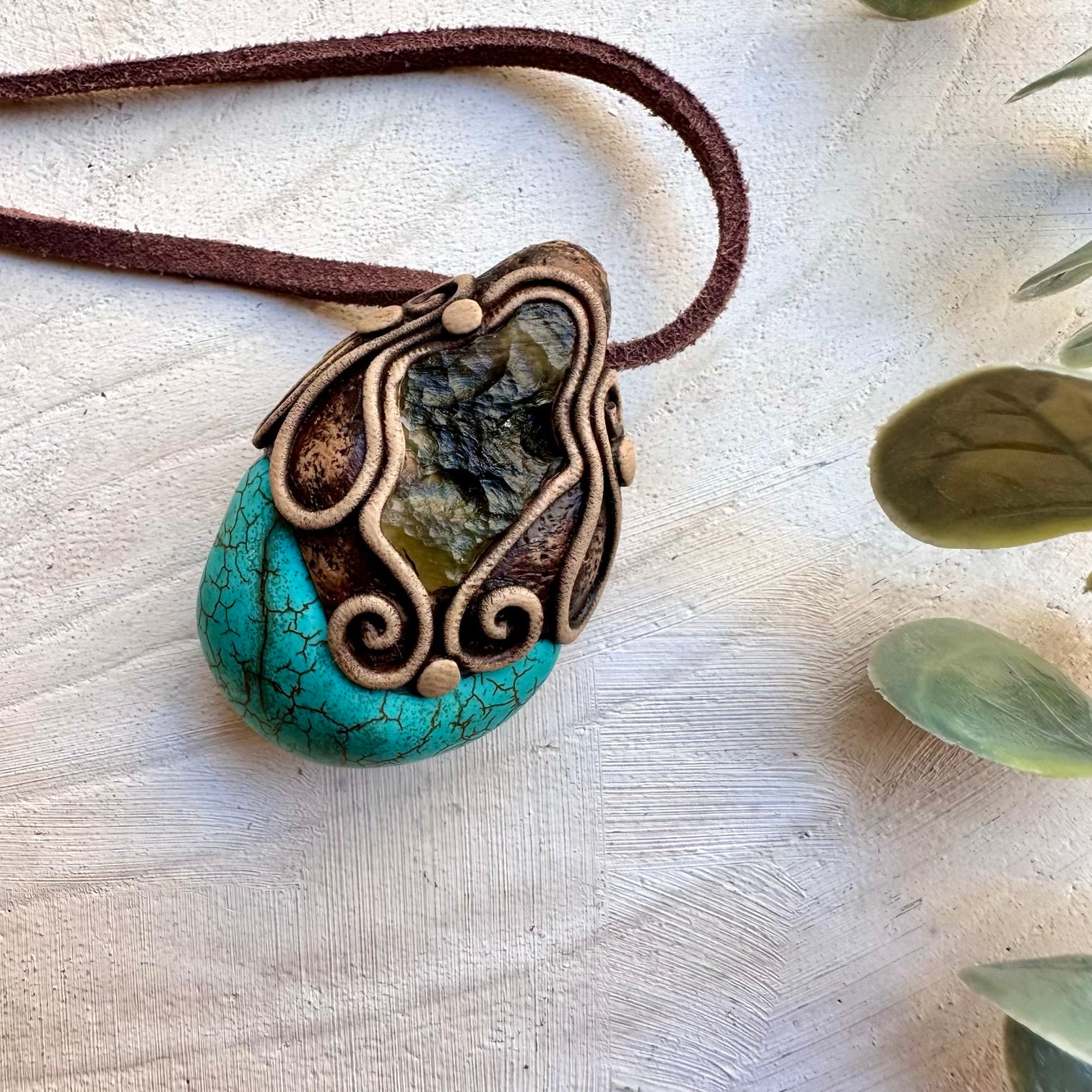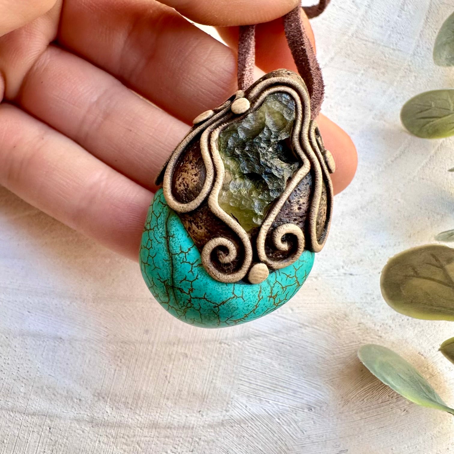 The Turquoise and Moldavite Pendant, Unisex Handmade Necklace is made with durable clay and it comes with adjustable leather cord.