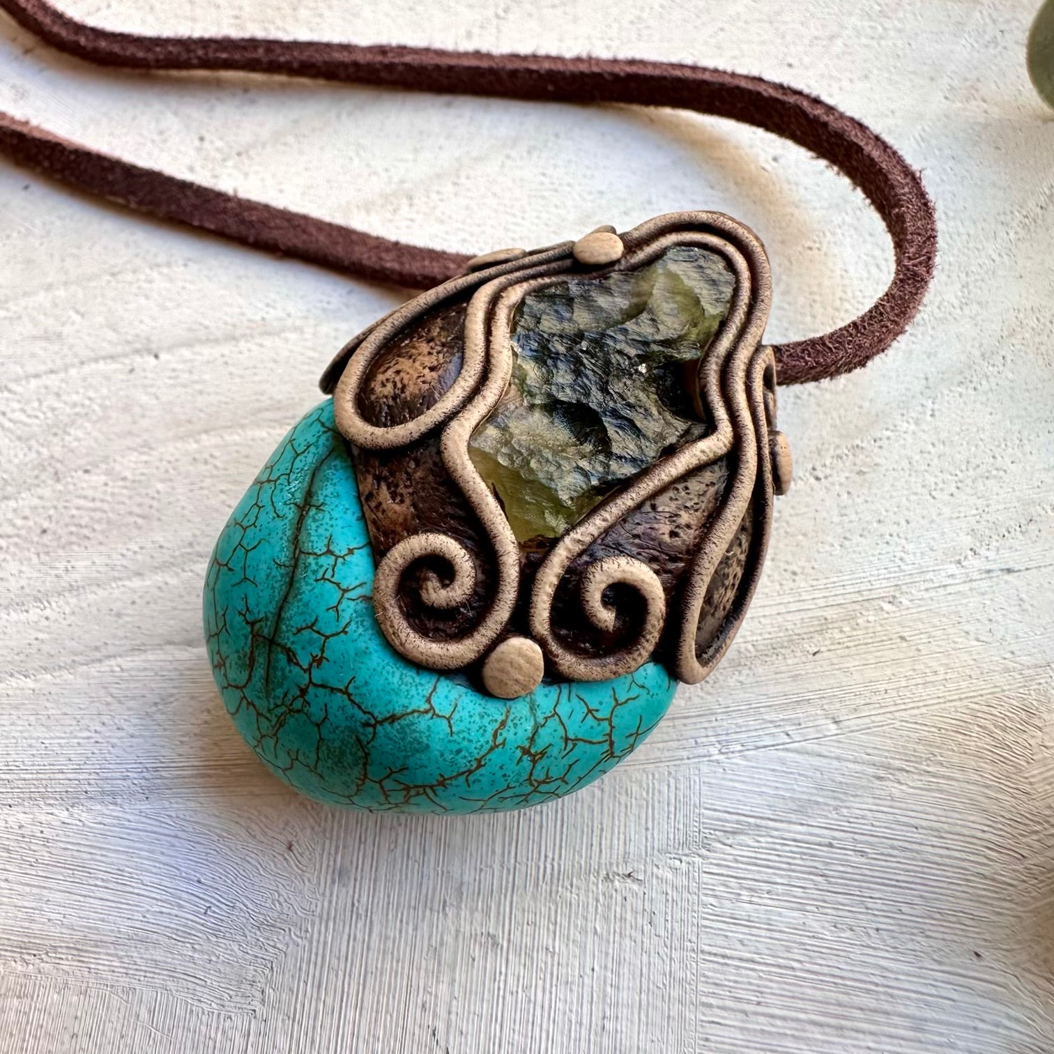 Turquoise gemstone paired with moldavite in a unisex clay necklace