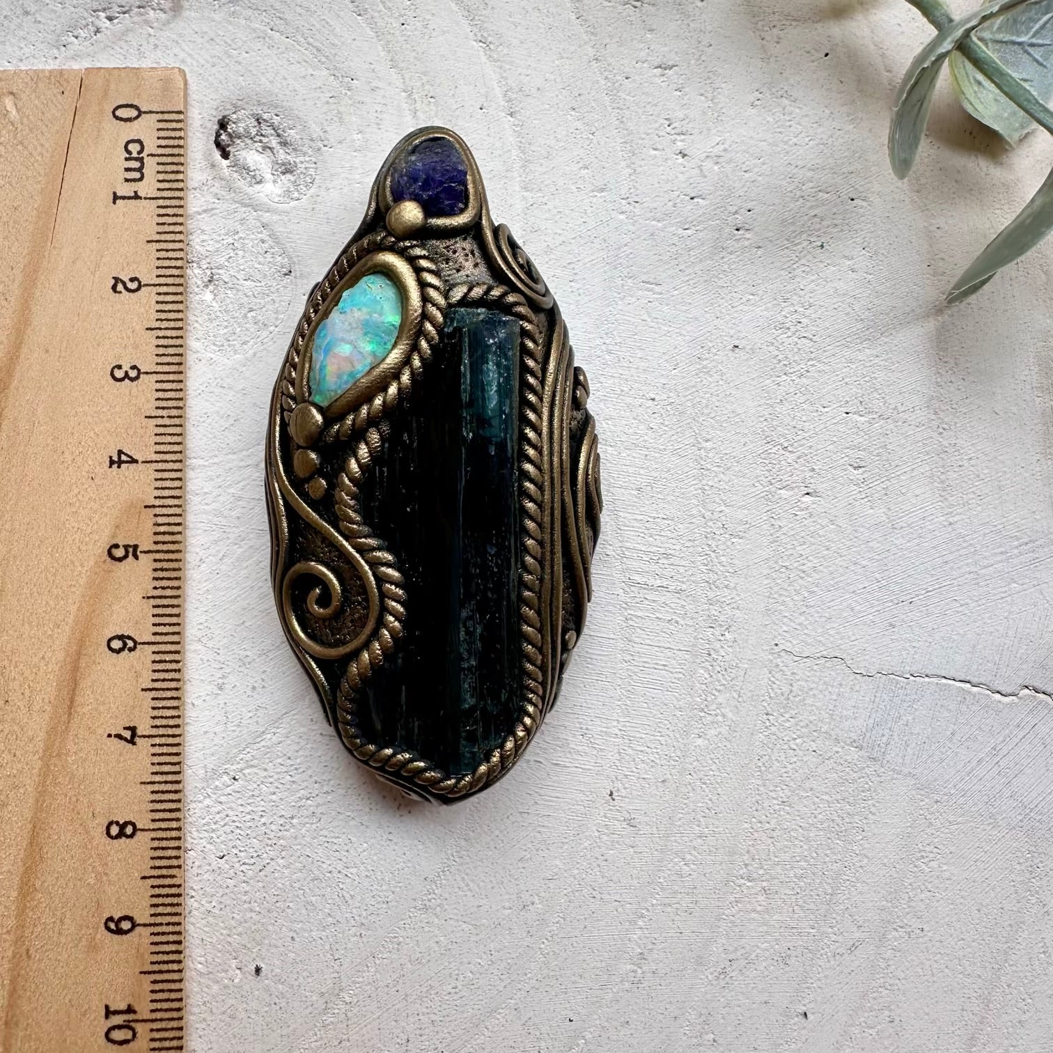 Fragile handcrafted elements. Polymer clay details, handcrafted mounts, metal components, and crystal settings can break if bent, dropped, or exposed to force. Please handle with care.